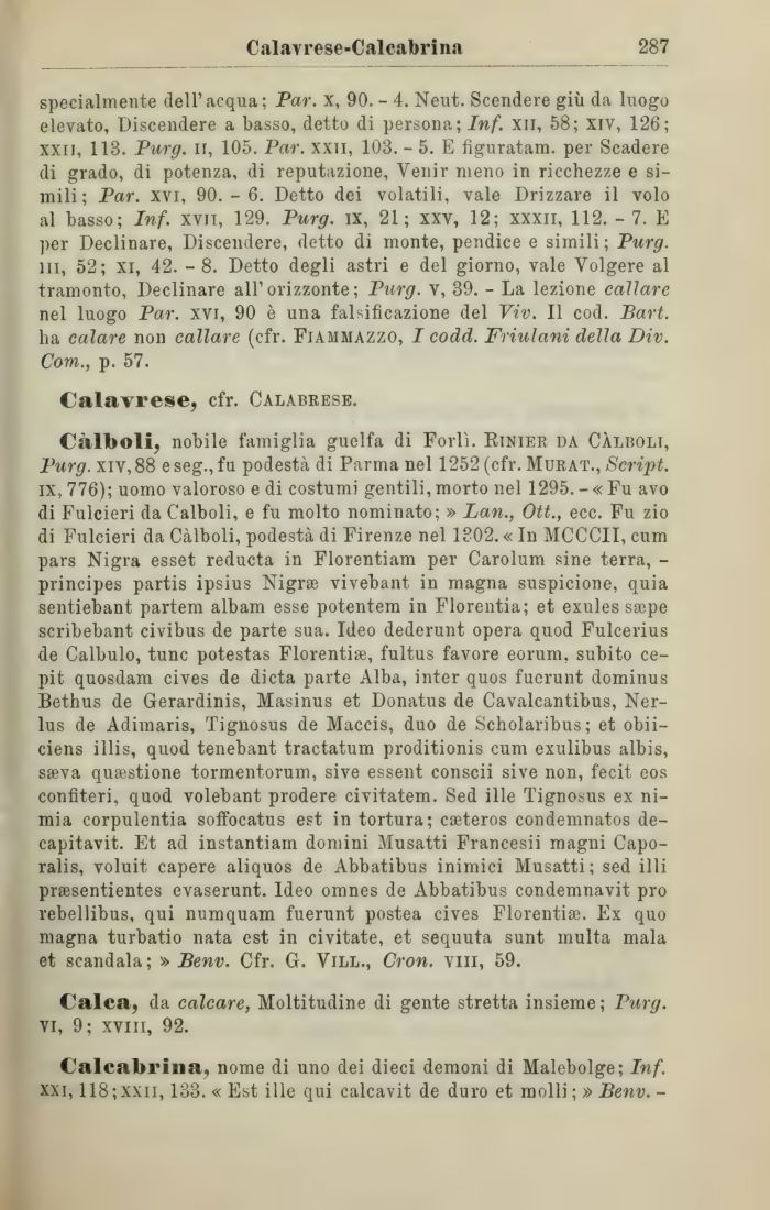 Càlboli, nobile famiglia guelfa di Forlì. Rinier da Càlboli, Purg. xiy, 88 e seg., fu podestà di Parma nel 1252 (cfr. Murat., Script. ix, 776); uomo valoroso e di costumi gentili, morto nel 1295. - « Fu avo di Fulcieri da Càlboli, e fu molto nominato; » Lan., Ott., ecc. Fu zio di Fulcieri da Càlboli, podestà di Firenze nel 1802. « In MCCCII, cum pars Nigra esset reducta in Florentiam per Carolum sine terra, -principes partis ipsius Nigras vivebant in magna suspicione, quia sentiebant partem albam esse potentem in Florentia; et exules sajpe scribebant civibus de parte sua. Ideo dederunt opera quod Fulcerius de Calbulo, tunc potestas Florentise, fultus favore eorum, subito ce-pit quosdam cives de dieta parte Alba, inter quos fuerunt dominus Bethus de Gerardinis, Masinus et Donatus de Cavalcantibus, Ner-lus de Adimaris, Tignosus de Maccis, duo de Scholaribus; et obii-ciens illis, quod tenebant tractatum proditionis cum exulibus albis, sseva questione tormentorum, sive essent conscii sive non, fecit eos confìteri, quod volebant prodere civitatem. Sed ille Tignosus ex ni-mia corpulenta soffocatus est in tortura; casteros condemnatos de-capitavit. Et ad instantiam domini Musatti Francesii magni Capo-ralis, voluit capere aliquos de Abbatibus inimici Musatti; sed il 1 i praesentientes evaserunt. Ideo omnes de Abbatibus condemnavit prò rebellibus, qui numquam fuerunt postea cives Florentise. Ex quo magna turbatio nata est in civitate, et sequuta sunt multa mala et scandala ; » Benv. Cfr. G. Vill., Cron. vili, 59.