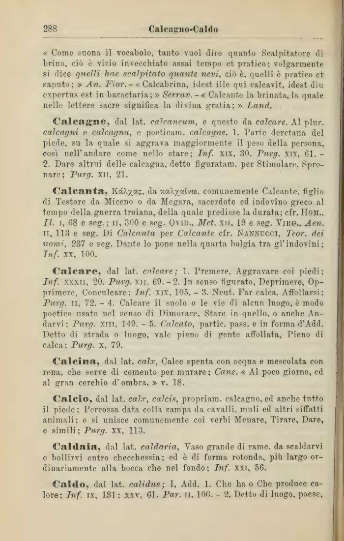 Calcare, dal lat. calcare; 1. Premere, Aggravare coi piedi; Inf. xxxn, 20. Purg. xir, 69.-2. In senso figurato, Deprimere, Opprimere, Conculcare; Inf. xix, 105. - 3. Neut. Far calca, Affollarsi; Purg. il, 72. - 4. Calcare il suolo o le vie di alcun luogo, è modo poetico usato nel senso di Dimorare, Stare in quello, o anche Andarvi ; Purg. xnr, 149. - 5. Calcato, partic. pass, e in forma d'Add. Detto di strada o luogo, vale pieno di gente affollata, Pieno di calca; Purg. x, 79.