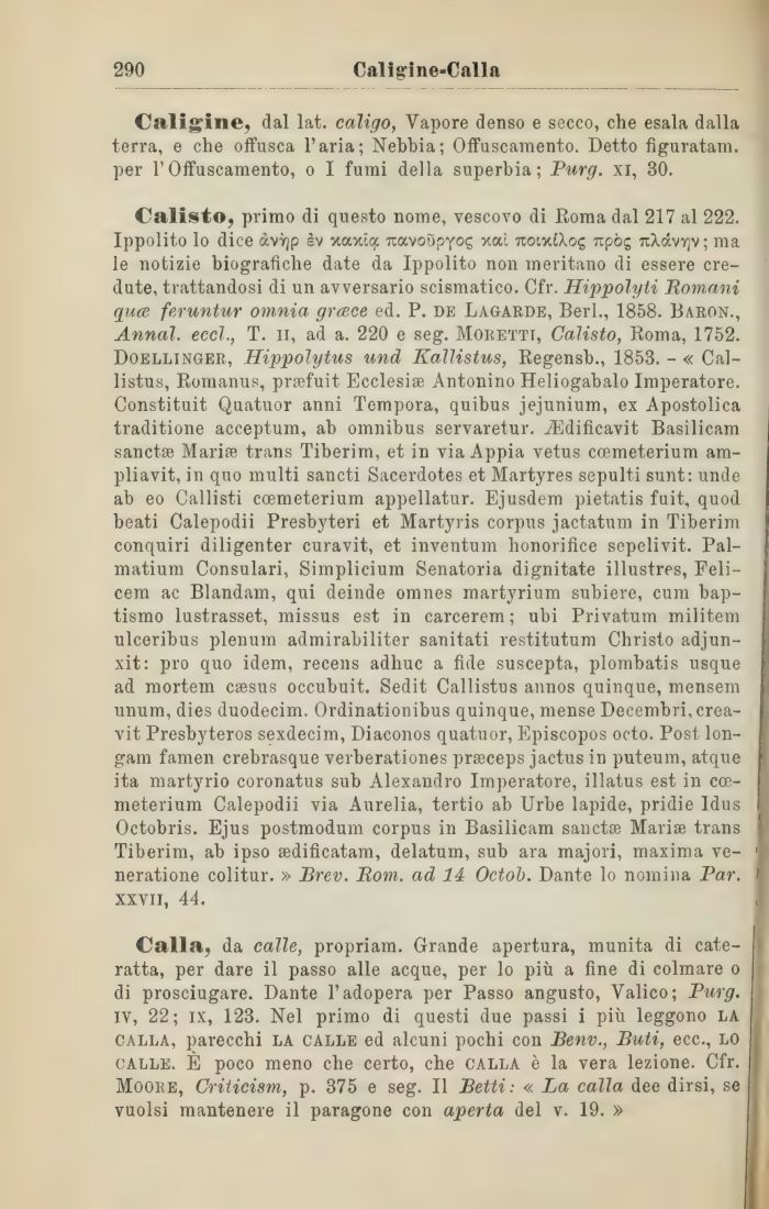 Calisto, primo di questo nome, vescovo di Roma dal 217 al 222. Ippolito lo dice àvìrjp sv xaxiq: uavoSpyog xai uoixiXog rcpòg uXàvvjv; ma le notizie biografiche date da Ippolito non meritano di essere credute, trattandosi di un avversario scismatico. Cfr. Hippolyti Romani quce feruntur omnia grcece ed. P. de Lagarde, Beri., 1858. Baron., Annal. eccl., T. n, ad a. 220 e seg. Moretti, Calisto, Roma, 1752. Doellinger, Hippolytus und Kallistus, Regensb., 1853. - « Cal-listus, Romanus, prsefuit Ecclesise Antonino Heliogabalo Imperatore. Constituit Quatuor anni Tempora, quibus jejunium, ex Apostolica traditione acceptum, ab omnibus servaretur. iEdificavit Basilicam sanctse Marine trans Tiberim, et in via Appia vetus coemeterium am-pliavit, in quo multi sancti Sacerdotes et Martyres sepulti sunt: unde ab eo Callisti coemeterium appellatur. Ejusdem pietatis fuit, quod beati Calepodii Presbyteri et Martyris corpus jactatum in Tiberim conquiri diligenter curavit, et inventum lionorifice sepelivit. Pal-matium Consulari, Simplicium Senatoria dignitate illustres, Feli-cem ac Blandam, qui deinde omnes martyrium subiere, cum bap-tismo lustrasset, missus est in carcerem ; ubi Privatum militem ulceribus plenum admirabiliter sanitati restitutum Christo adjun-xit: prò quo idem, recens adhuc a fide suscepta, plombatis usque ad mortem csesus occubuit. Sedit Callistus annos quinque, mensem unum, dies duodecim. Ordinationibus quinque, mense Decembri, crea-vit Presbyteros sexdecim, Diaconos quatuor, Episcopos octo. Post lon-gam famen crebrasque verberationes praceps jactus in puteum, atque ita martyrio coronatus sub Alexandre Imperatore, illatus est in coemeterium Calepodii via Aurelia, tertio ab Urbe lapide, pridie ldus f Octobris. Ejus postmodum corpus in Basilicam sanctEB Marise trans Tiberim, ab ipso tedificatam, delatum, sub ara majori, maxima ve-neratione colitur. » Brev. Bom. ad 14 Octob. Dante lo nomina Par. ' xxvii, 44. J