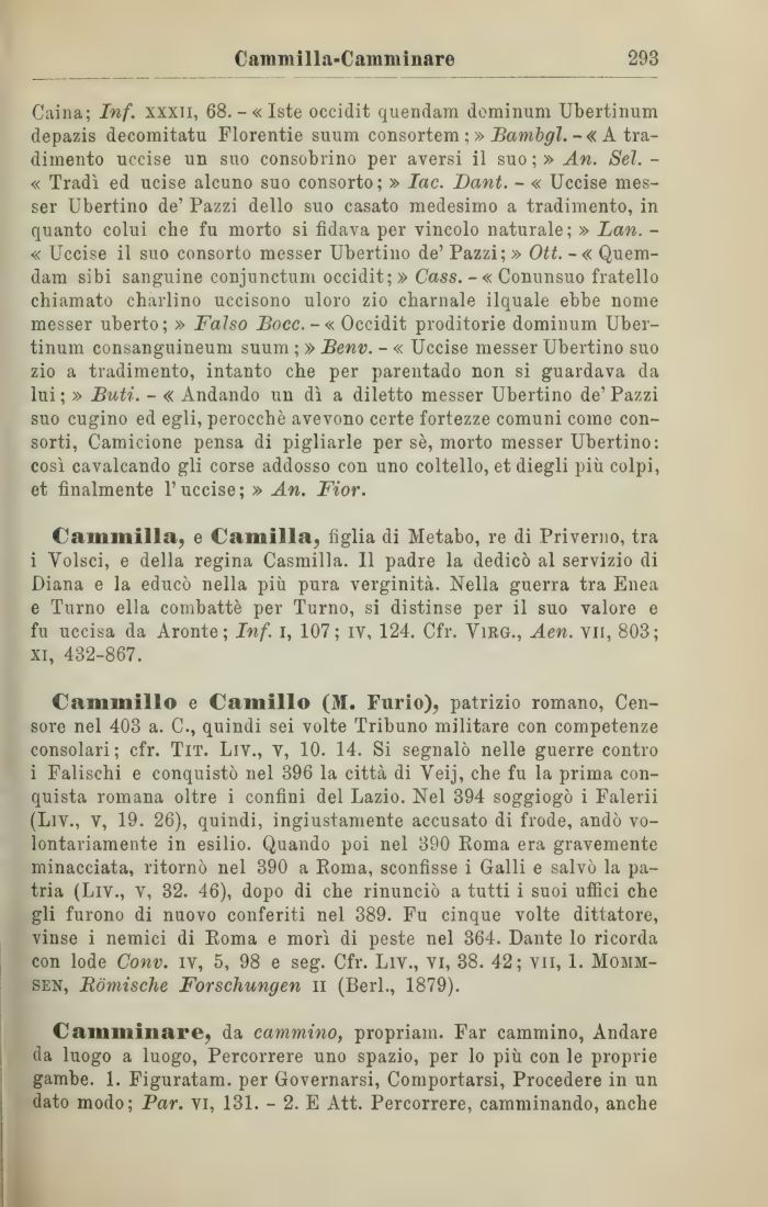 Cammillo e Camillo (M. Furio), patrizio romano, Censore nel 403 a. C., quindi sei volte Tribuno militare con competenze consolari; cfr. Tit. Liv., v, 10. 14. Si segnalò nelle guerre contro i Falischi e conquistò nel 396 la città di Veij, che fu la prima conquista romana oltre i confini del Lazio. Nel 394 soggiogò i Falerii (LiV., v, 19. 26), quindi, ingiustamente accusato di frode, andò volontariamente in esilio. Quando poi nel 390 Roma era gravemente minacciata, ritornò nel 390 a Roma, sconfisse i Galli e salvò la patria (Liv., v, 32. 46), dopo di che rinunciò a tutti i suoi uffici che gli furono di nuovo conferiti nel 389. Fu cinque volte dittatore, vinse i nemici di Roma e morì di peste nel 364. Dante lo ricorda con lode Conv. iv, 5, 98 e seg. Cfr. Liv., vi, 38. 42; vii, 1. Momm-sen, Bòmische Forschungen li (Beri., 1879).