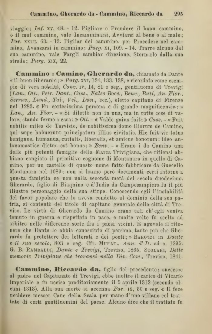 Cammino o Camino, Gherardo da, chiamato da Dante « il buon Gherardo; » Purg. xvr, 124,133,138, e ricordato come esempio di vera nobiltà, Conv. iv, 14, 81 e seg., gentiluomo di Trevigi (Lan., Ott., Petr. Dani., Cass., Falso Bocc., Benv., Buti, An. Fior., Serrav., Land., Tal., Vel., Dan., ecc.), eletto capitano di Firenze nel 1283. « Fu cortesissima persona e di grande magnificenzia; » Lan., An. Fior. - « Si dilettò non in una, ma in tutte cose di valore, stando fermo a casa ; » Ott. - « Yalde gaius fuit; » Cass. - « Fuit nobilis miles de Tarvisio, de nobilissima domo illorum de Camino, qui ssepe habuerunt principatum illius civitatis. Hic fuit vir totus benignus, humanus, curialis, liberalis, et amicus honorum: ideo an-tonomastice dictus est bonus; » Benv. - « Erano i da Camino una delle più potenti famiglie della Marca Trivigiana, che ritiensi abbiano cangiato il primitivo cognome di Montanara in quello di Camino, per un castello di questo nome fatto fabbricare da Guecello Montanara nel 1089; non si hanno però documenti certi intorno a questa famiglia se non nella seconda metà del secolo duodecimo. Gherardo, figlio di Biaquino e d'India da Camposampiero fu il più illustre personaggio della sua stirpe. Conoscendo egli l'instabilità del favor popolare che lo aveva condotto al dominio della sua patria, si contentò del titolo di capitano generale della città di Treviso. Le virtù di Gherardo da Camino erano tali eh' egli veniva temuto in guerra e rispettato in pace, e molte volte fu scelto ad arbitro nelle differenze sorte fra i paesi vicini. E agevole il ritenere che Dante lo abbia conosciuto di persona, tanto più che Gherardo fu protettore dei letterati e dei poeti ; » Barozzi in Dante e il suo secolo, 803 e seg. Cfr. Mueat., Ann. d'It. ad a. 1295. G. B. Rambaldi, Dante e Trevigi, Treviso, 1865. Scolari, Delle memorie Trivigiane che trovansi nella Div. Com., Treviso, 1841.