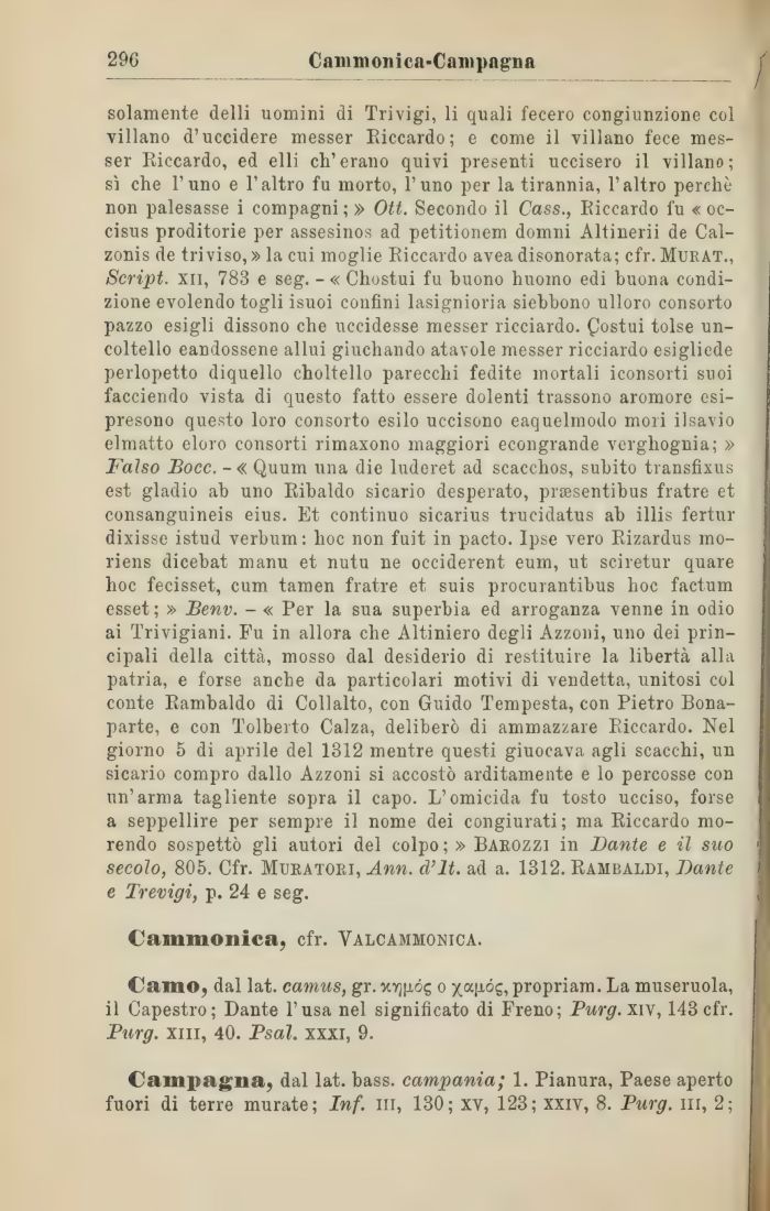 solamente delli uomini di Trivigi, li quali fecero congiunzione col villano d'uccidere messer Riccardo; e come il villano fece mes-ser Riccardo, ed elli ch'erano quivi presenti uccisero il villano; sì che l'uno e l'altro fu morto, l'uno per la tirannia, l'altro perchè non palesasse i compagni; » Ott. Secondo il Cass., Riccardo fu « oc-cisus proditorie per assesinos ad petitionem domni Altinerii de Cal-zonis de triviso, » la cui moglie Riccardo avea disonorata; cfr. MurAT., Script, xii, 783 e seg. - « Chostui fu buono huoino edi buona condizione evolendo togli isuoi confini lasignioria siebbono ulloro consorto pazzo esigli dissono che uccidesse messer ricciardo. Costui tolse un-coltello eandossene allui giuchando atavole messer ricciardo esigliede perlopetto diquello choltello parecchi fedite mortali iconsorti suoi facciendo vista di questo fatto essere dolenti trassono aromore esi-presono questo loro consorto esilo uccisono eaquelmodo mori ilsavio elmatto eloro consorti rimaxono maggiori econgrande verghognia; » Falso Bocc. -« Quum una die luderet ad scacchos, subito transfixus est gladio ab uno Ribaldo sicario desperato, prEesentibus fratre et consanguineis eius. Et continuo sicarius trucidatus ab illis fertur dixisse istud verbum: hoc non fuit in pacto. Ipse vero Rizardus mo-riens dicebat manu et nutu ne occiderent eum, ut sciretur quare hoc fecisset, cum tamen fratre et suis procurantibus hoc factum esset; » Benv. - « Per la sua superbia ed arroganza venne in odio ai Trivigiani. Fu in allora che Altiniero degli Azzoni, uno dei principali della città, mosso dal desiderio di restituire la libertà alla patria, e forse anche da particolari motivi di vendetta, unitosi col conte Rambaldo di Collalto, con Guido Tempesta, con Pietro Bona-parte, e con Tolberto Calza, deliberò di ammazzare Eiccardo. Nel giorno 5 di aprile del 1312 mentre questi giuocava agli scacchi, un sicario compro dallo Azzoni si accostò arditamente e lo percosse con un'arma tagliente sopra il capo. L'omicida fu tosto ucciso, forse a seppellire per sempre il nome dei congiurati; ma Riccardo morendo sospettò gli autori del colpo ; » Barozzi in Dante e il suo 1 secolo, 805. Cfr. Muratori, Ann. d'it. ad a. 1312. Rambaldi, Dante e Trevigi, p. 24 e seg.