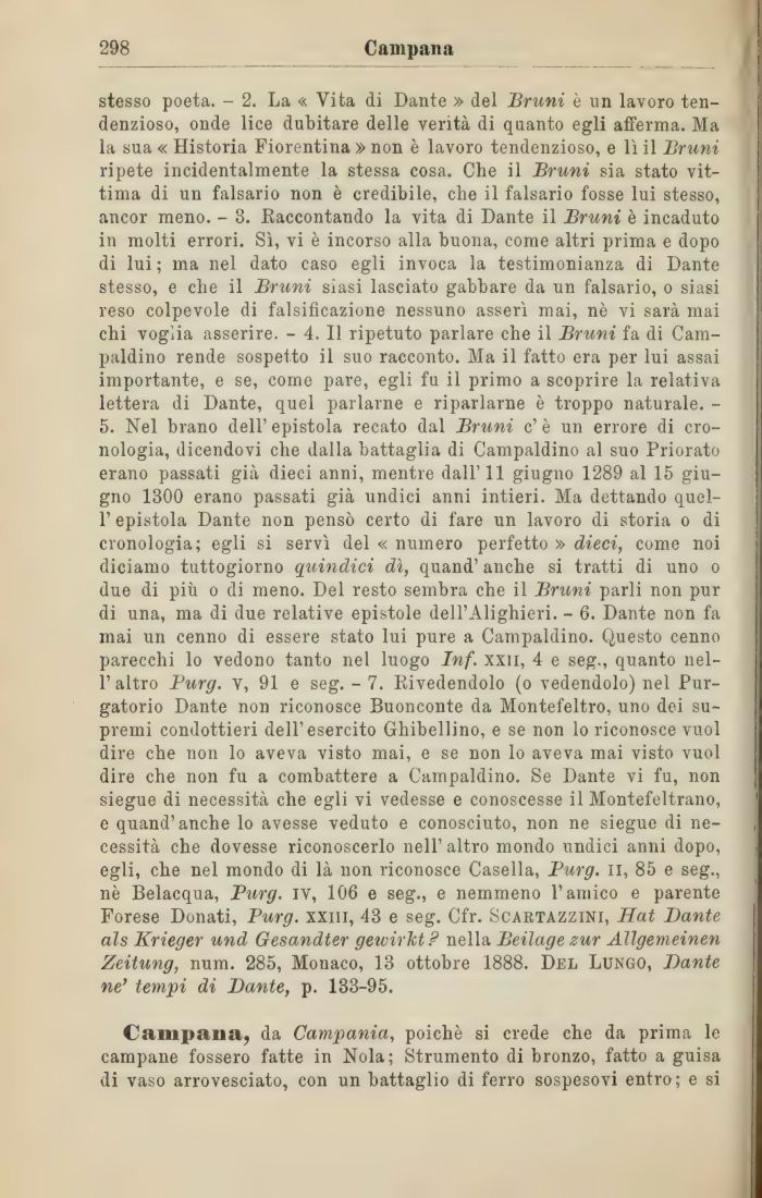 stesso poeta. - 2. La « Vita di Dante » del Bruni è un lavoro tendenzioso, onde lice dubitare delle verità di quanto egli afferma. Ma la sua « Historia Fiorentina » non è lavoro tendenzioso, e lì il Bruni ripete incidentalmente la stessa cosa. Che il Bruni sia stato vittima di un falsario non è credibile, che il falsario fosse lui stesso, ancor meno. - 3. Raccontando la vita di Dante il Bruni è incaduto in molti errori. Sì, vi è incorso alla buona, come altri prima e dopo di lui ; ma nel dato caso egli invoca la testimonianza di Dante stesso, e che il Bruni siasi lasciato gabbare da un falsario, o siasi reso colpevole di falsificazione nessuno asserì mai, nè vi sarà mai chi voglia asserire. - 4. Il ripetuto parlare che il Bruni fa di Cam-paldino rende sospetto il suo racconto. Ma il fatto era per lui assai importante, e se, come pare, egli fu il primo a scoprire la relativa lettera di Dante, quel parlarne e riparlarne è troppo naturale. -5. Nel brano dell' epistola recato dal Bruni e' è un errore di cronologia, dicendovi che dalla battaglia di Campaldino al suo Priorato erano passati già dieci anni, mentre dall' 11 giugno 1289 al 15 giugno 1300 erano passati già undici anni intieri. Ma dettando quel-l'epistola Dante non pensò certo di fare un lavoro di storia o di cronologia; egli si servì del « numero perfetto » dieci, come noi diciamo tuttogiorno quindici dì, quand' anche si tratti di uno o due di più o di meno. Del resto sembra che il Bruni parli non pur di una, ma di due relative epistole dell'Alighieri. - 6. Dante non fa mai un cenno di essere stato lui pure a Campaldino. Questo cenno parecchi lo vedono tanto nel luogo Inf. xxn, 4 e seg., quanto nel-l'altro Purg. v, 91 e seg. - 7. Rivedendolo (o vedendolo) nel Purgatorio Dante non riconosce Buonconte da Montefeltro, uno dei supremi condottieri dell'esercito Ghibellino, e se non lo riconosce vuol dire che non lo aveva visto mai, e se non lo aveva mai visto vuol dire che non fu a combattere a Campaldino. Se Dante vi fu, non siegue di necessità che egli vi vedesse e conoscesse il Montefeltrano, e quand'anche lo avesse veduto e conosciuto, non ne siegue di ne- I cessità che dovesse riconoscerlo nell' altro mondo undici anni dopo, egli, che nel mondo di là non riconosce Casella, Purg. il, 85 e seg., nè Belacqua, Purg. IV, 106 e seg., e nemmeno l'amico e parente Forese Donati, Purg. xxiii, 43 e seg. Cfr. Scartazzini, Hat Dante aìs Krieger und Gesandter gewirktP nella Beilage zur Allgemeinen Zeitung, num. 285, Monaco, 13 ottobre 1888. Del Lungo, Dante ne' tempi di Dante, p. 183-95.