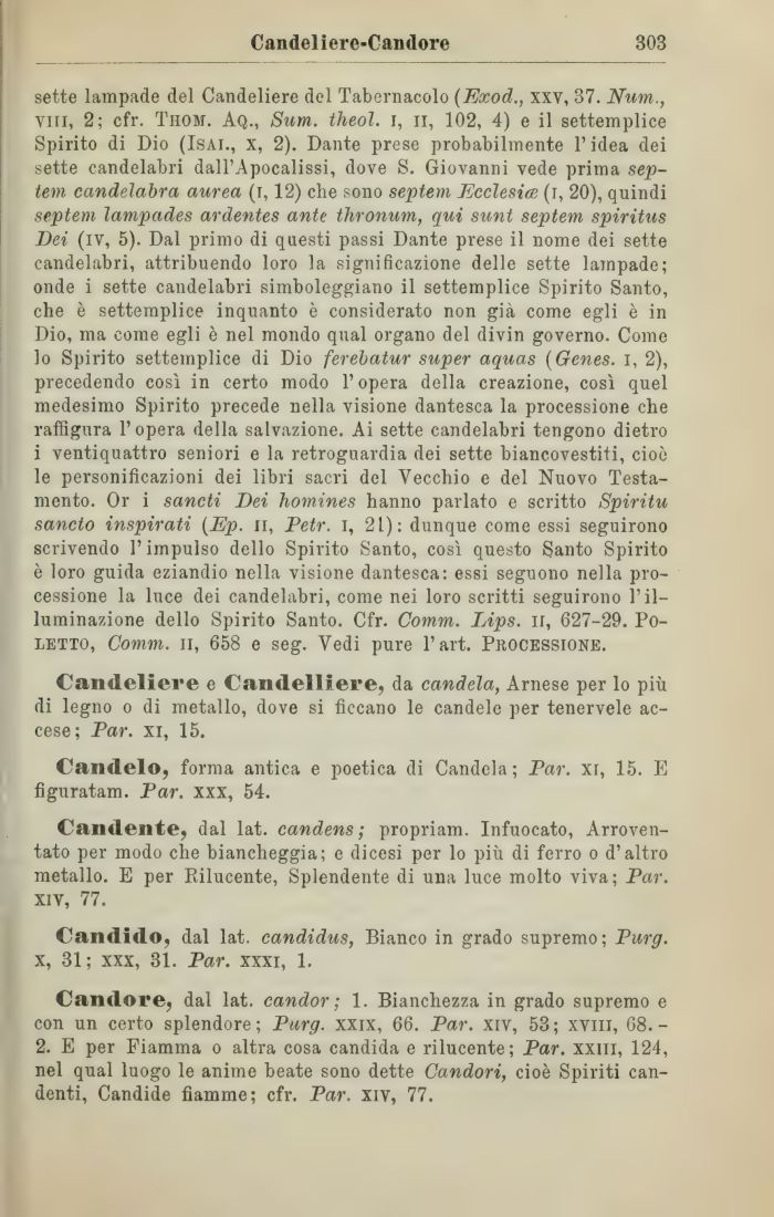 sette lampade del Candeliere del Tabernacolo (Exod., xxv, 37. Num., vili, 2; cfr. Thom. Aq., Sum. theol. i, il, 102, 4) e il settemplice Spirito di Dio (Isai., x, 2). Dante prese probabilmente l'idea dei sette candelabri dall'Apocalissi, dove S. Giovanni vede prima septem candelabro, aurea (i, 12) che sono septem Ecclesia (i, 20), quindi septem lampades ardentes ante thronum, qui sunt septem spiritus Dei (iv, 5). Dal primo di questi passi Dante prese il nome dei sette candelabri, attribuendo loro la significazione delle sette lampade; onde i sette candelabri simboleggiano il settemplice Spirito Santo, che è settemplice inquanto è considerato non già come egli è in Dio, ma come egli è nel mondo qual organo del divin governo. Como lo Spirito settemplice di Dio ferebatur super aquas (Genes. i, 2), precedendo così in certo modo l'opera della creazione, così quel medesimo Spirito precede nella visione dantesca la processione che raffigura l'opera della salvazione. Ai sette candelabri tengono dietro i ventiquattro seniori e la retroguardia dei sette biancovestiti, cioè le personificazioni dei libri sacri del Vecchio e del Nuovo Testamento. Or i sancii Dei homines hanno parlato e scritto Spiritu sancto inspirati (Ep. n, Petr. i, 21): dunque come essi seguirono scrivendo l'impulso dello Spirito Santo, così questo Santo Spirito è loro guida eziandio nella visione dantesca: essi seguono nella processione la luce dei candelabri, come nei loro scritti seguirono l'illuminazione dello Spirito Santo. Cfr. Comm. Lips. n, 627-29. Po-letto, Comm. ii, 658 e seg. Vedi pure l'art. Processione.