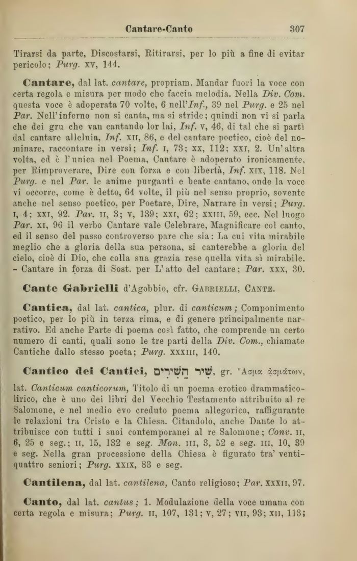 Cantare, dal lat. cantare, propriam. Mandar fuori la voce con certa regola e misura per modo che faccia melodia. Nella Div. Com. questa voce è adoperata 70 volte, 6 neWInf., 39 nel Purg. e 25 nel Par. Nell'inferno non si canta, ma si stride; quindi non vi si parla che dei gru che vali cantando lor lai, Inf. v, 46, di tal che si partì dal cantare alleluia, Inf. xn, 86, e del cantare poetico, cioè del nominare, raccontare in versi; Inf. i, 73; xx, 112; xxr, 2. Un'altra volta, ed è l'unica nel Poema, Cantare è adoperato ironicamente, per Rimproverare, Dire con forza e con libertà, Inf. xix, 118. Nel Purg. e nel Par. le anime purganti e beate cantano, onde la voce vi occorre, come è detto, 64 volte, il più nel senso proprio, sovente anche nel senso poetico, per Poetare, Dire, Narrare in versi ; Purg. r, 4; xxi, 92. Par. II, 3; Y, 139; xxr, 62; xxni, 59, ecc. Nel luogo Par. xi, 96 il verbo Cantare vale Celebrare, Magnificare col canto, ed il senso del passo controverso pare che sia: La cui vita mirabile meglio che a gloria della sua persona, si canterebbe a gloria del cielo, cioè di Dio, che colla sua grazia rese quella vita sì mirabile. - Cantare in forza di Sost. per L'atto del cantare ; Par. xxx, 30.