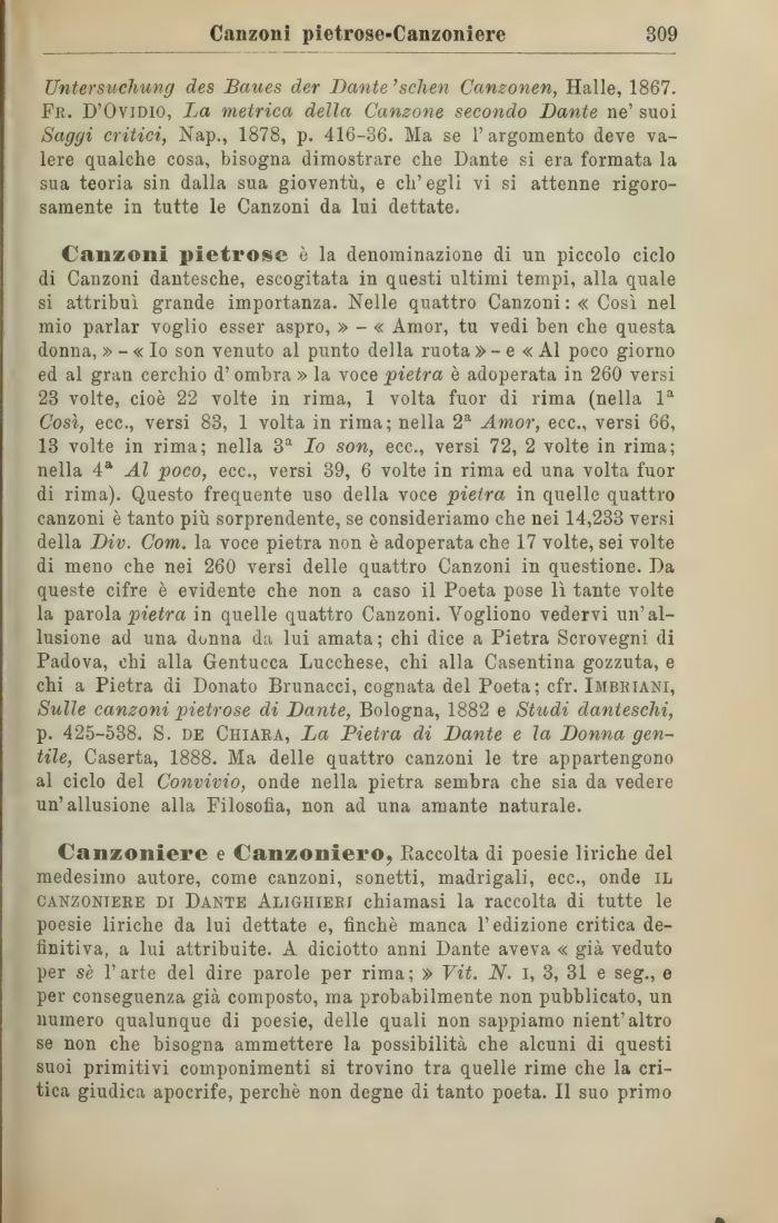 Untersuchung des Baues der Dante 'schen Canzonen, Halle, 1867. Fr. D'Ovidio, La metrica della Canzone secondo Dante ne' suoi Saggi critici, Nap., 1878, p. 416-36. Ma se l'argomento deve valere qualche cosa, bisogna dimostrare che Dante si era formata la sua teoria sin dalla sua gioventù, e ch'egli vi si attenne rigorosamente in tutte le Canzoni da lui dettate.