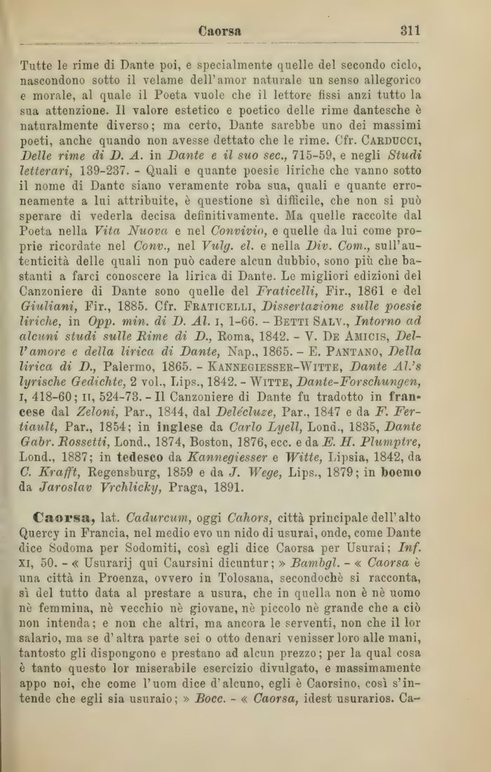 Caorsa, lat. Cadurcum, oggi Cahors, città principale dell'alto Quercy in Francia, nel medio evo un nido di usurai, onde, come Dante dice Sodoma per Sodomiti, così egli dice Caorsa per Usurai ; Inf. xi, 50. - « Usurarij qui Caursini dicuntur ; » Bambgl. - « Caorsa è una città in Proenza, ovvero in Tolosana, secondochè si racconta, sì del tutto data al prestare a usura, che in quella non è nè uomo nè femmina, nè vecchio nè giovane, nè piccolo nè grande che a ciò non intenda; e non che altri, ma ancora le serventi, non che il lor salario, ma se d'altra parte sei o otto denari venisserloro alle mani, tantosto gli dispongono e prestano ad alcun prezzo; per la qual cosa è tanto questo lor miserabile esercizio divulgato, e massimamente appo noi, che come l'uom dice d'alcuno, egli è Caorsino, così s'intende che egli sia usuraio ; » Bocc. - « Caorsa, idest usurarios. Ca-