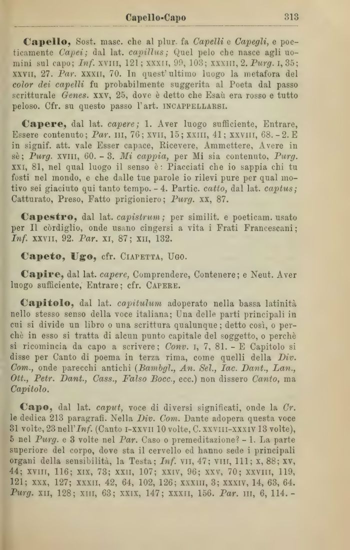 Capello, Sost. masc. che al plur. fa Capelli e Capegli, e poeticamente Capei; dal lat. capillus; Quel pelo che nasce agli uomini sul capo; Inf. xvm, 121; xxxit, 99, 103; xxxill, 2. Purg. i, 35; xxvil, 27. Par. XXXii, 70. In quest'ultimo luogo la metafora del color dei capelli fu probabilmente suggerita al Poeta dal passo scritturale Genes. xxv, 25, dove è detto che Esaù era rosso e tutto peloso. Cfr. su questo passo l'art, incappellarsi.