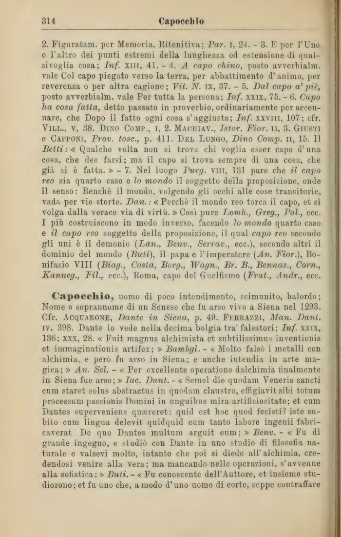 Capocchio, uomo di poco intendimento, scimunito, balordo; Nome o soprannome di un Senese che fu arso vivo a Siena nel 1293. Cfr. Acquarone, Dante in Siena, p. 49. Fkrrazzi, 3Ian. Dant. iv, 398. Dante lo vede nella decima bolgia tra'falsatori; Inf. xxix, 136; xxx, 28. « Fuit magnus alchimista et subtilissimus inventionis et immaginationis artifex; » Bambgl. - « Molto falsò i metalli con alchimia, e però fu arso in Siena; e anche intendia in arte magica; » An. Sei. - « Per excellente operatione dalchimia finalmente in Siena fue arso;» Jae. Dant. -«Semel die quodam Yeneris sancti cum staret solus abstractus in quodam claustro, effigiavit sibi totum processum passionis Domini in unguibus mira artifìciositate; et cum Dantes superveniens qurereret: quid est hoc quod fecisti? iste subito cum lingua delevit quidquid cum tanto labore ingenii fabri-caverat De quo Dantes multum arguit eum ; » Benv. - « Fu di grande ingegno, e studiò con Dante in uno studio di filosofia naturale e valsevi molto, intanto che poi si diede all'alchimia, credendosi venire alla vera; ma mancando nelle operazioni, s'avvenne alla sofistica; » Buti.-« Fu conoscente dell'Auttore, et insieme stu-diorono; et fu uno che, a modo d'uno uomo di corte, seppe contraffare