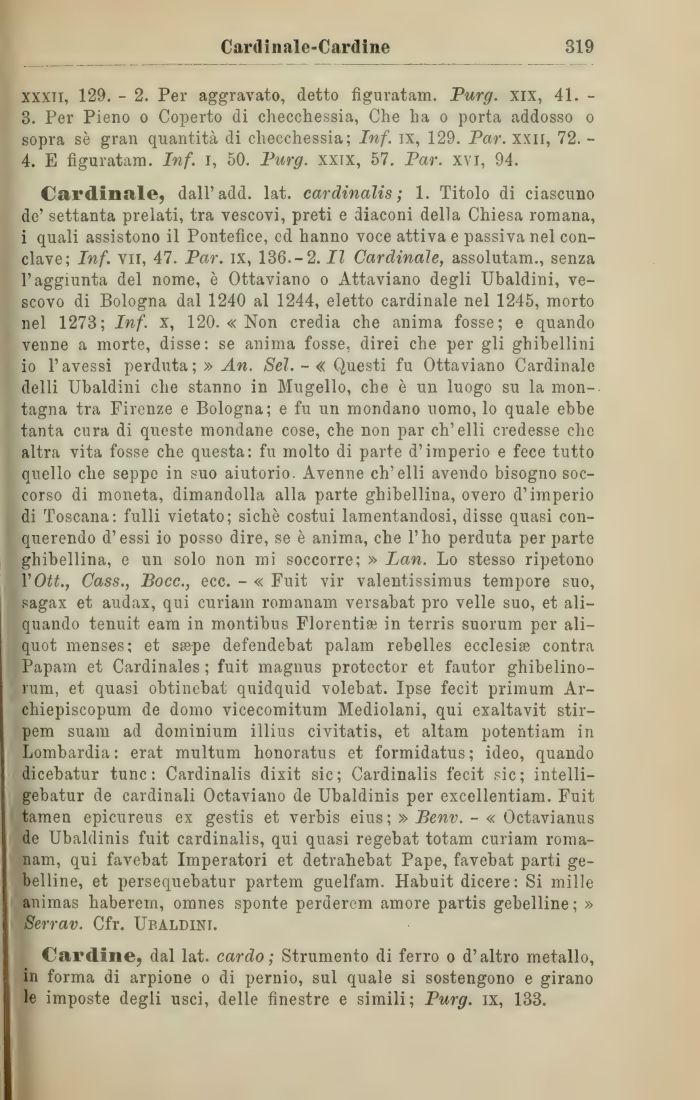 Cardinale, dall'add. lat. cardinalis ; 1. Titolo di ciascuno de' settanta prelati, tra vescovi, preti e diaconi della Chiesa romana, i quali assistono il Pontefice, ed hanno voce attiva e passiva nel conclave; Inf. vii, 47. Par. ix, 136.-2. Il Cardinale, assolutam., senza l'aggiunta del nome, è Ottaviano o Attaviano degli Ubaldini, vescovo di Bologna dal 1240 al 1244, eletto cardinale nel 1245, morto nel 1273; Inf. x, 120. « Non credia che anima fosse; e quando venne a morte, disse: se anima fosse, direi che per gli ghibellini io l'avessi perduta; » An. Sei. - « Questi fu Ottaviano Cardinale delli Ubaldini che stanno in Mugello, che è un luogo su la mon-tagna tra Firenze e Bologna; e fu un mondano uomo, lo quale ebbe tanta cura di queste mondane cose, che non par ch'elli credesse che altra vita fosse che questa: fu molto di parte d'imperio e fece tutto quello che seppe in suo aiutorio. Avenne ch'elli avendo bisogno soccorso di moneta, dimandolla alla parte ghibellina, overo d'imperio di Toscana: fulli vietato; sichè costui lamentandosi, disse quasi con-querendo d'essi io posso dire, se è anima, che l'ho perduta per parte ghibellina, e un solo non mi soccorre; » Lan. Lo stesso ripetono VOtt., Cass., Bocc., ecc. - « Fuit vir valentissimus tempore suo, pagax et audax, qui curiam romanam versabat prò velie suo, et ali-quando tenuit eam in montibus Florentise in terris suorum per ali-quot menses; et ssepe defendebat palarti rebelles ecclesia contra Papam et Cardinales ; fuit magnus protcctor et fautor ghibelino-rum, et quasi obtinebat quidquid volebat. Ipse fecit primum Ar-chiepiscopum de domo vicecomitum Mediolani, qui exaltavit stir-pem suam ad dominium illius civitatis, et altam potentiam in Lombardia: erat multum honoratus et formidatus; ideo, quando dicebatur tunc : Cardinalis dixit sic; Cardinalis fecit sic; intelli-gebatur de cardinali Octaviano de Ubaldinis per excellentiam. Fuit tamen epicureus ex gestis et verbis eius; » Benv. - « Octavianus de Ubaldinis fuit cardinalis, qui quasi regebat totam curiam romanam, qui favebat Imperatori et detrahebat Pape, favebat parti ge-belline, et persequebatur partem guelfam. Habuit dicere : Si mille animas haberem, omnes sponte perderem amore partis gebelline ; » Serrav. Cfr. Ubaldini.