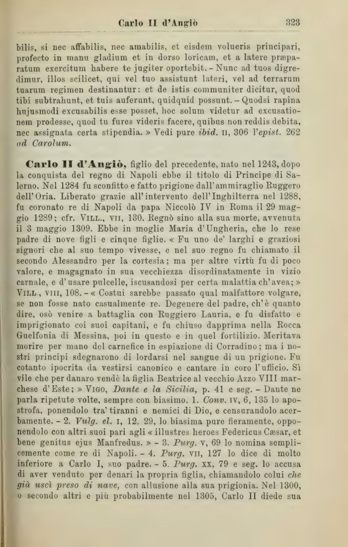 Carlo li d'Aiijjiò, figlio del precedente, nato nel 1243, dopo la conquista del regno di Napoli ebbe il titolo di Principe di Salerno. Nel 1284 fu sconfitto e fatto prigione dall'ammiraglio Ruggero dell'Oria. Liberato grazie all'intervento dell'Inghilterra nel 1288, fu coronato re di Napoli da papa Niccolò IV in Roma il 29 maggio 1289; cfr. VlLL., Vii, 130. Regnò sino alla sua morte, avvenuta il 3 maggio 1309. Ebbe in moglie Maria d'Ungheria, che lo rese padre di nove figli e cinque figlie. « Fu uno de' larghi e graziosi signori che al suo tempo vivesse, e nel suo regno fu chiamato il secondo Alessandro per la cortesia; ma per altre virtù fu di poco valore, e magagnato in sua vecchiezza disordinatamente in vizio carnale, e d'usare pulcelle, iscusandosi per certa malattia eh'avea; » VlLL-, vili, 108.-« Costui sarebbe passato qual malfattore volgare, se non fosse nato casualmente re. Degenere del padre, eh'è quanto dire, osò venire a battaglia con Ruggiero Lauria, e fu disfatto e imprigionato coi suoi capitani, e fu chiuso dapprima nella Rocca Guelfonia di Messina, poi in questo e in quel fortilizio. Meritava morire per mano del carnefice in espiazione di Corradino; ma i nostri principi sdegnarono di lordarsi nel sangue di un prigione. Fu cotanto ipocrita da vestirsi canonico e cantare in coro l'ufficio. Sì vile che per danaro vendè la figlia Beatrice al vecchio Azzo Vili marchese d'Este; » Vigo, Dante e la Sicilia, p. 41 e seg. - Dante ne parla ripetute volte, sempre con biasimo. 1. Conv. iv, 6, 135 lo apostrofa, ponendolo tra'tiranni e nemici di Dio, e censurandolo acerbamente. - 2. Vulg. el. I, 12, 29, lo biasima pure fieramente, opponendolo con altri suoi pari agli « illustres heroes Federicus Cassar, et bene genitus ejus Manfredus. » - 3. Purg. v, 69 lo nomina semplicemente come re di Napoli. - 4. Purg. vii, 127 lo dice di molto inferiore a Carlo I, suo padre. - 5. Purg. xx, 79 e seg. lo accusa di aver venduto per denari la propria figlia, chiamandolo colui che già uscì preso di nave, con allusione alla sua prigionia. Nel 1300, o secondo altri e più probabilmente nel 1305, Carlo II diede sua