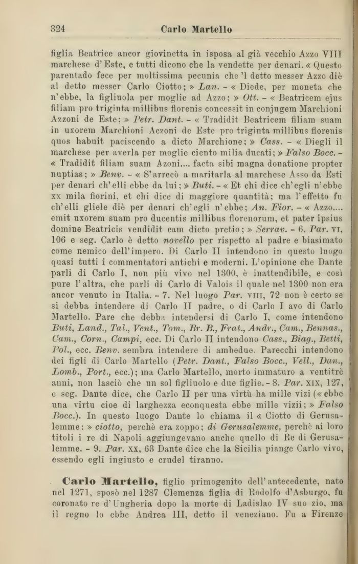 figlia Beatrice ancor giovinetta in isposa al già vecchio Azzo Vili marchese d' Este, e tutti dicono che la vendette per denari. « Questo parentado fece per moltissima pecunia che '1 detto messer Azzo die al detto messer Carlo Ciotto; » Lan. - « Diede, per moneta che n'ebbe, la figliuola per moglie ad Azzo; » Ott. - « Beatricem ejus filiam prò triginta millibus fiorenis concessit in conjugem Marcliioni Azzoni de Este; » Petr. Dant. - « Tradidit Beatricem filiam suam in uxorem Marchioni Aczoni de Este prò triginta millibus fiorenis quos habuit paciscendo a dicto Marchione;» Cass. - « Diegli il marchese per averla per moglie ciento milia ducati; » Falso Bocc. -« Tradidit filiam suam Azoni.... facta sibi magna donatione propter nuptias; » Benv. - « S'arrecò a maritarla al marchese Asso da Esti per denari ch'elli ebbe da lui ; » Buti. - « Et chi dice ch'egli n'ebbe xx mila fiorini, et chi dice di maggiore quantità; ma l'effetto fu ch'elli gliele diè per denari ch'egli n'ebbe; An. Fior. - « Azzo.... emit uxorem suam prò ducentis millibus florenorum, et pater ipsius domine Beatricis vendidit eam dicto pretio ; » Serrav. - 6. Par. vi, 106 e seg. Carlo è detto novello per rispetto al padre e biasimato come nemico dell'impero. Di Carlo II intendono in questo luogo quasi tutti i commentatori antichi e moderni. L'opinione che Dante parli di Carlo I, non più vivo nel 1300, è inattendibile, e così pure l'altra, che parli di Carlo di Valois il quale nel 1300 non era ancor venuto in Italia. - 7. Nel luogo Par. vili, 72 non è certo se si debba intendere di Carlo II padre, o di Carlo I avo di Carlo Martello. Pare che debba intendersi di Carlo I, come intendono Buti, Land., Tal., Vent., Tom., Br. B., Frat., Andr., Cam., Bennas., Cam., Corn., Campi, ecc. Di Carlo II intendono Cass., Biag., Betti, Poi., ecc. Benv. sembra intendere di ambedue. Parecchi intendono dei figli di Carlo Martello (Petr. Dant., Falso Bocc., Veli., Dan., Ijomb., Port., ecc.); ma Carlo Martello, morto immaturo a ventitré anni, non lasciò che un sol figliuolo e due figlie.-8. Par. xix, 127, e seg. Dante dice, che Carlo II per una virtù ha mille vizi («ebbe una virtù cioè di larghezza econquesta ebbe mille vizii \ » Falso Bocc.). In questo luogo Dante lo chiama il « Ciotto di Gerusalemme : » ciotto, perchè era zoppo ; di Gerusalemme, perchè ai loro titoli i re di Napoli aggiungevano anche quello di Re di Gerusalemme. - 9. Par. xx, 63 Dante dice che la Sicilia piange Carlo vivo, essendo egli ingiusto e crudel tiranno.