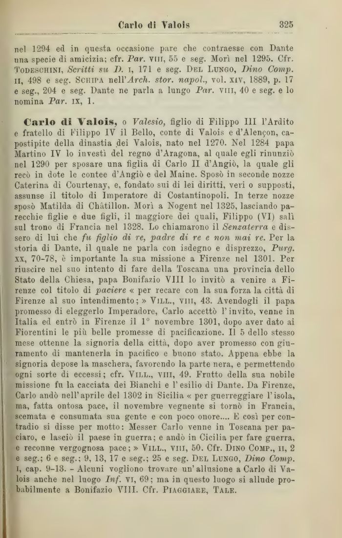 Carlo <11 Valois, o Valesio, figlio di Filippo III l'Ardito e fratello di Filippo IV il Bello, conte di Valois e d'Alengon, capostipite della dinastia dei Valois, nato nel 1270. Nel 1284 papa Martino IV lo investì del regno d'Aragona, al quale egli rinunziò nel 1290 per sposare una figlia di Carlo II d'Angiò, la quale gli recò in dote le contee d'Angiò e del Maine. Sposò in seconde nozze Caterina di Courtenay, e, fondato sui di lei diritti, veri o supposti, assunse il titolo di Imperatore di Costantinopoli. In terze nozze sposò Matilda di Chàtillon. Morì a Nogent nel 1325, lasciando parecchie figlie e due figli, il maggiore dei quali, Filippo (VI) salì sul trono di Francia nel 1328. Lo chiamarono il Senzaterra e dissero di lui che fu figlio di re, padre di re e non mai re. Per la storia di Dante, il quale ne parla con isdegno e disprezzo, Purg. xx, 70-78, è importante la sua missione a Firenze nel 1301. Per riuscire nel suo intento di fare della Toscana una provincia dello Stato della Chiesa, papa Bonifazio Vili lo invitò a venire a Firenze col titolo di paciere « per recare con la sua forza la città di Firenze al suo intendimento; » Vill., vili, 43. Avendogli il papa promesso di eleggerlo Imperadore, Carlo accettò l'invito, venne in Italia ed entrò in Firenze il 1° novembre 1301, dopo aver dato ai Fiorentini le più belle promesse di pacificazione. Il 5 dello stesso mese ottenne la signoria della città, dopo aver promesso con giuramento di mantenerla in pacifico e buono stato. Appena ebbe la signoria depose la maschera, favorendo la parte nera, e permettendo ogni sorte di eccessi ; cfr. Vill., vili, 49. Frutto della sua nobile missione fu la cacciata dei Bianchi e 1' esilio di Dante. Da Firenze, Carlo andò nell'aprile del 1302 in Sicilia « per guerreggiare l'isola, ma, fatta ontosa pace, il novembre vegnente si tornò in Francia, scemata e consumata sua gente e con poco onore.... E così per con-tradio si disse per motto: Messer Carlo venne in Toscana per pa-ciaro, e lasciò il paese in guerra; e andò in Cicilia per fare guerra, e reconne vergognosa pace; » Vill., vili, 50. Cfr. Dino Comp., ii, 2 e seg.; 6 e seg.; 9, 13, 17 e seg.; 25 e seg. Del Lungo, Dino Comp. i, cap. 9-13. - Alcuni vogliono trovare un' allusione a Carlo di Valois anche nel luogo Inf. vi, 69; ma in questo luogo si allude probabilmente a Bonifazio Vili. Cfr. Piaggiare, Tale.
