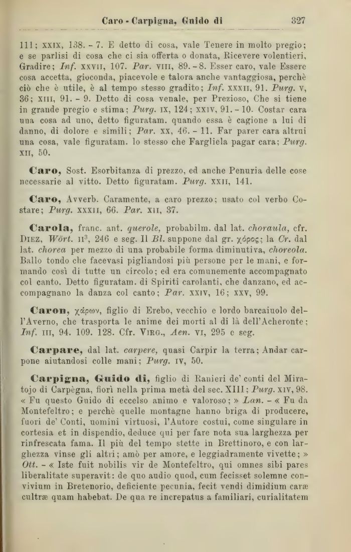 Carpiona, Guido €li, figlio di Ranieri de'conti del Mira-tojo di Carpègna, fiorì nella prima metà del sec. XIII ; Purg. xiv, 98. « Fu questo Guido di eccelso animo e valoroso ; » Lan. - « Fu da Montefeltro; e perchè quelle montagne hanno briga di producere, fuori de' Conti, uomini virtuosi, l'Autore costui, come singulare in cortesia et in dispendio, deduce qui per fare nota sua larghezza per rinfrescata fama. Il più del tempo stette in Brettinoro, e con larghezza vinse gli altri; amò per amore, e leggiadramente vivette; » Ott. - « Iste fuit nobilis vir de Montefeltro, qui omnes sibi pares liberalitate superavit: de quo audio quod, eum fecisset solemne con-vivium in Bretenorio, deficiente pecunia, fecit vendi dimidium caraj cultrse quam habebat. De qua re increpatus a familiari, curialitatem