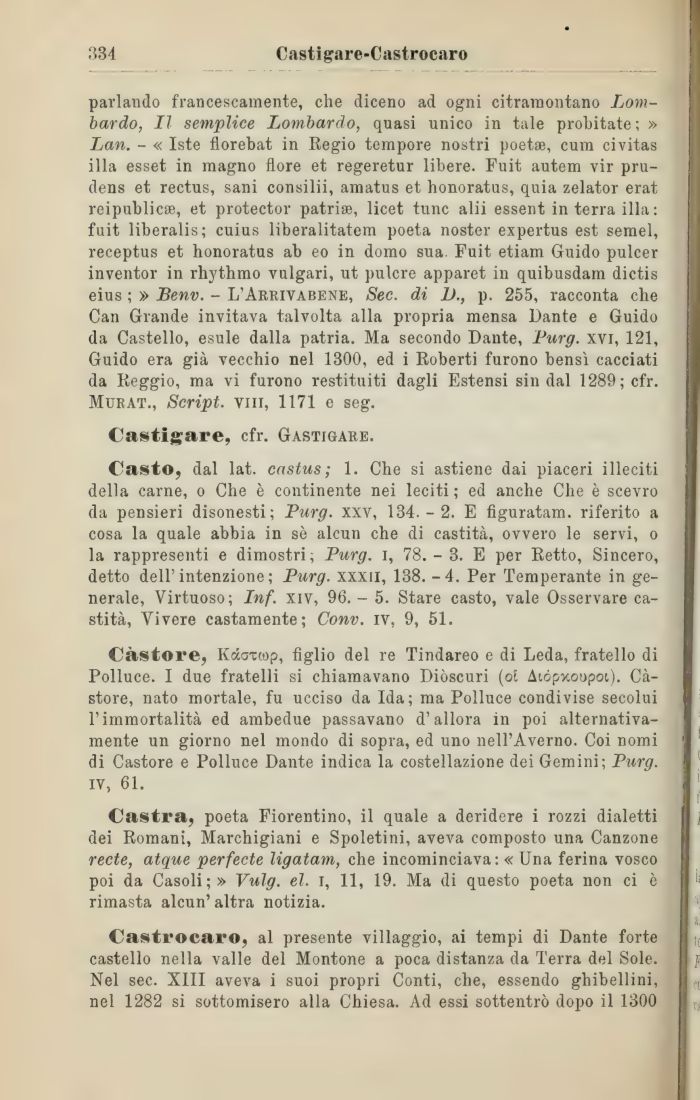Casto, dal lat. castus; 1. Che si astiene dai piaceri illeciti della carne, o Che è continente nei leciti ; ed anche Che è scevro da pensieri disonesti; Purg. xxv, 134.-2. E fìguratam. riferito a cosa la quale abbia in sè alcun che di castità, ovvero le servi, o la rappresenti e dimostri; Purg. i, 78. - 3. E per Retto, Sincero, detto dell'intenzione; Purg. xxxn, 138. -4. Per Temperante in generale, Virtuoso; Inf. xiv, 96. - 5. Stare casto, vale Osservare castità, Vivere castamente; Conv. iv, 9, 51.