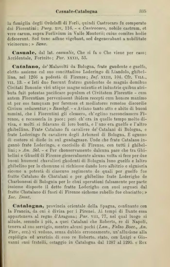 Catalano, de'Malavolti da Bologna, frate gaudente e guelfo, eletto assieme col suo concittadino Loderingo di Liandolo, ghibellino, nel 1266 a podestà di Firenze; Inf. xxm, 104. Cfr. Vili,., vii, 13. - « Isti duo fuerunt fratres gaudentes de magnis domibus Civitati Bononiae viri utique magne scientie et industrie quibus atributa fuit potestas pacificare populum et Civitatem Florentie - cum autem Florentiam pervenissent ibidem recepti cum honore maximo ut per eos tamquam per forenses et mediatores remotos discordie Civium sedarentur ; » Bambgl. - « Aviano tanto atto e abito di buoni uomini, che i Fiorentini gli elessero, ch'eglino racconciassero Firenze, e recasserla in pace; però ch'era in quello tempo molto divisa, e molti si fidavano di loro bontà, e l'uno era guelfo e l'altro ghibellino. Frate Catalano fu cavaliere de' Catalani di Bologna, e frate Loderingo fu cavaliere degli Arbonesi di Bologna. E ognuno di costoro si diede in sul guadagnare. Unde che frate Catalano ingannò frate Loderingo, e cacciollo di Firenze, con tutti i ghibellini ; » An. Sei. - « Per chonservamento dalcuna pace che tra Ghi-belini e Ghuelfi di Firenze gieneralmente alcuna volta si fece per due buoni huomeni chavalieri ghodenti di Bolognia luno guelfo e laltro ghibelino per lo chomune si richiesse dando loro albitrio e signioria sicome a potestà di ciascuno regimento de quali per guelfo fue fratte Catalano de Chatalani e per ghibelino frate Loderigho de Charbonessi di Bolognia per le chui operationi falsamente per parte insieme disposte il detto fratte Loderigho con suoi seguaci dal fratte Chatalano di fuori di Firenze sichome rubello fue chaciatto;» Iac. Dant.