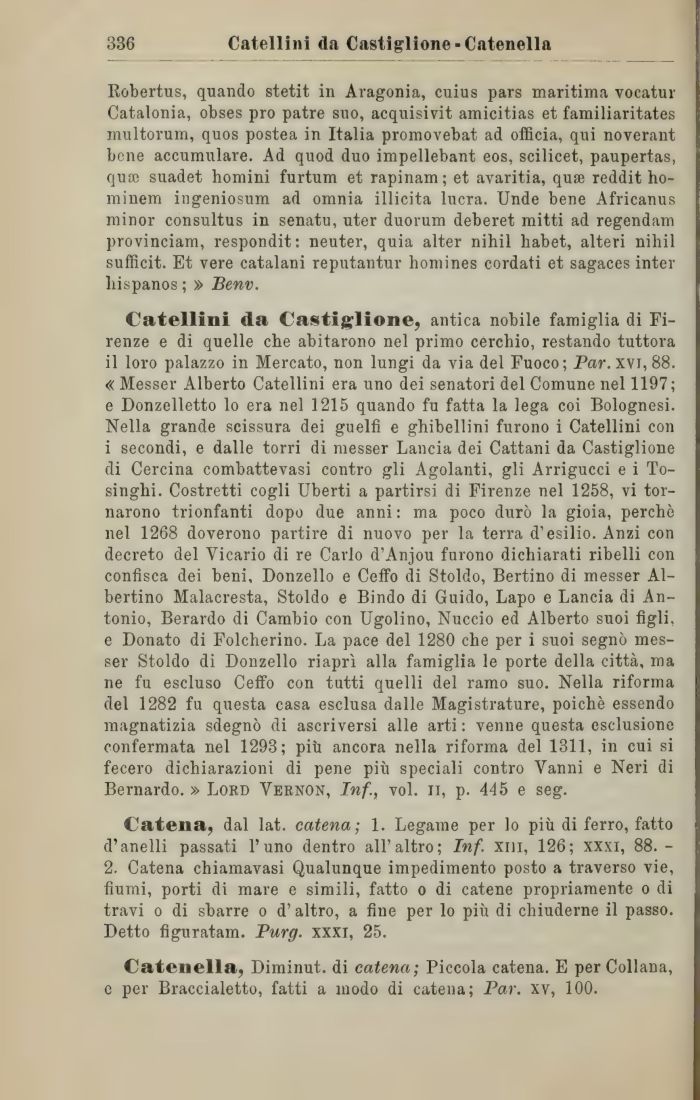 Catellini da Castiglione, antica nobile famiglia di Firenze e di quelle che abitarono nel primo cerchio, restando tuttora il loro palazzo in Mercato, non lungi da via del Fuoco; Par. xvi, 88. « Messer Alberto Catellini era uno dei senatori del Comune nel 1197; e Donzelletto lo era nel 1215 quando fu fatta la lega coi Bolognesi. Nella grande scissura dei guelfi e ghibellini furono i Catellini con i secondi, e dalle torri di messer Lancia dei Cattani da Castiglione di Cercina combattevasi contro gli Agolanti, gli Arrigucci e i To-singhi. Costretti cogli Uberti a partirsi di Firenze nel 1258, vi tornarono trionfanti dopo due anni : ma poco durò la gioia, perchè nel 1268 doverono partire di nuovo per la terra d'esilio. Anzi con decreto del Vicario di re Carlo d'Anjou furono dichiarati ribelli con confisca dei beni. Donzello e Ceffo di Stoldo, Bertino di messer Albertino Malacresta, Stoldo e Bindo di Guido, Lapo e Lancia di Antonio, Berardo di Cambio con Ugolino, Nuccio ed Alberto suoi figli, e Donato di Folcherino. La pace del 1280 che per i suoi segnò messer Stoldo di Donzello riaprì alla famiglia le porte della città, ma ne fu escluso Ceffo con tutti quelli del ramo suo. Nella riforma del 1282 fu questa casa esclusa dalle Magistrature, poiché essendo magnatizia sdegnò di ascriversi alle arti : venne questa esclusione confermata nel 1293; più ancora nella riforma del 1311, in cui si fecero dichiarazioni di pene più speciali contro Vanni e Neri di Bernardo. » Lord Veruon, Inf., voi. li, p. 445 e seg.