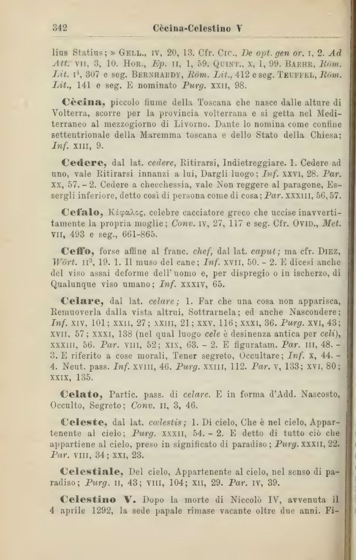 Celare, dal lat. celare; 1. Par che una cosa non apparisca, Remuoverla dalla vista altrui, Sottramela; ed anche Nascondere; Inf. xiv, 101; xxn, 27; axiii, 21; xxv, 116; xxxi, 36. Purg. xvi, 43; xvn, 57; xxxi, 138 (nel qual luogo cele è desinenza antica per celi), xxxiii, 56. Par. vili, 52; xix, 63. - 2. E figuratam. Par. ili, 48. -