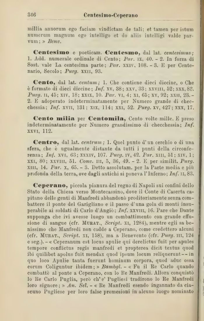 Cento, dal lat. centum; 1. Che contiene dieci diecine, o Che è formato di dieci diecine; Inf. xv, 38; xxv, 33; xxvm, 52; xxx, 83. Purg. il, 45; xiv, 18; xxix, 10. Par. vi, 4; xi, 65; xv, 92; xxii, 23.-