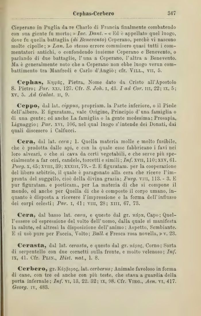 Cera, dal lat. cera; 1. Quella materia molle e molto fusibile, che è prodotta dalle api, e con la quale esse fabbricano i favi nei loro alveari, o che si cava da certi vegetabili, e che serve più specialmente a far ceri, candele, torcetti e simili ; Inf. xvii, 110; xxv, 61. Purg. x, 45 ; xvm, 39 ; xxxm, 79. - 2. E figuratam. per la cooperazione del libero arbitrio, il quale è paragonato alla cera che riceve l'impronta del suggello, cioè della divina grazia; Purg. vili, 113.- 3. E pur figuratam. e poeticam., per La materia di che si compone il mondo, ed anche per Quella di che è composto il corpo umano, inquanto è disposta a ricevere l'impressione e la forma dell'influsso dei corpi celesti; Par. i, 41; vili, 28; xiii, 67, 73.