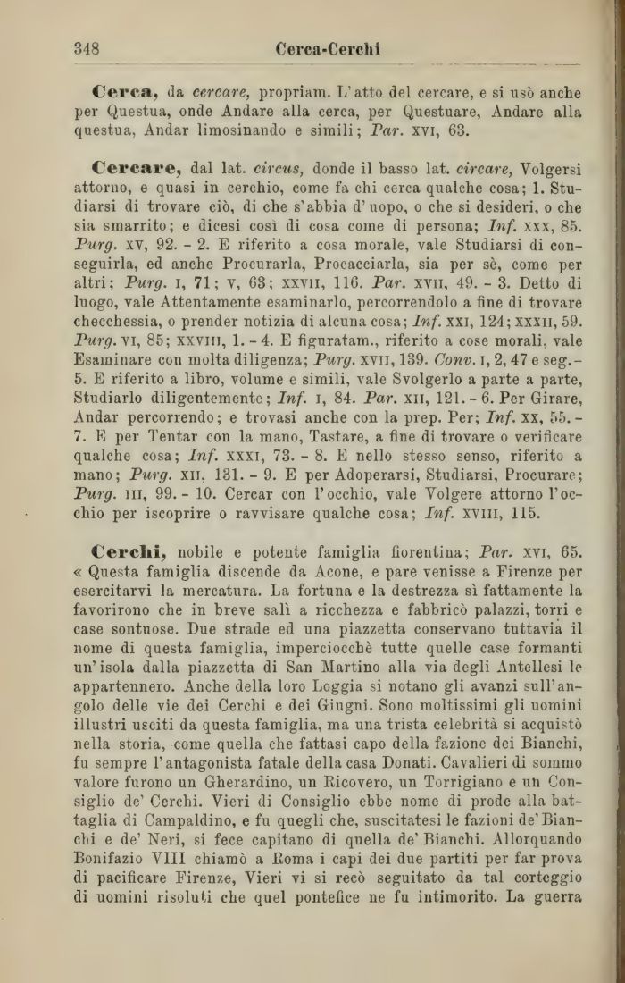 Cercare, dal lat. circus, donde il basso lat. circare, Volgersi attorno, e quasi in cerchio, come fa chi cerca qualche cosa; 1. Studiarsi di trovare ciò, di che s'abbia d'uopo, o che si desideri, o che sia smarrito; e dicesi cosi di cosa come di persona; Inf. xxx, 85. Purg. xv, 92. - 2. E riferito a cosa morale, vale Studiarsi di conseguirla, ed anche Procurarla, Procacciarla, sia per sè, come per altri; Purg. i, 71; v, 63; xxvii, 116. Par. xyii, 49. - 3. Detto di luogo, vale Attentamente esaminarlo, percorrendolo a fine di trovare checchessia, o prender notizia di alcuna cosa; Inf. xxi, 124; xxxii, 59. Purg. vi, 85; xxvin, 1.-4. E figuratam., riferito a cose morali, vale Esaminare con molta diligenza; Purg. xvn, 139. Conv. i, 2, 47 e seg.-5. E riferito a libro, volume e simili, vale Svolgerlo a parte a parte, Studiarlo diligentemente; Inf. i, 84. Par. xii, 121.- 6. Per Girare, Andar percorrendo; e trovasi anche con la prep. Per; Inf. xx, 55.-7. E per Tentar con la mano, Tastare, a fine di trovare o verificare qualche cosa; Inf. xxxi, 73. - 8. E nello stesso senso, riferito a mano; Purg. xn, 131. - 9. E per Adoperarsi, Studiarsi, Procurare; Purg. in, 99.- 10. Cercar con l'occhio, vale Volgere attorno l'occhio per iscoprire o ravvisare qualche cosa; Inf. xviii, 115.