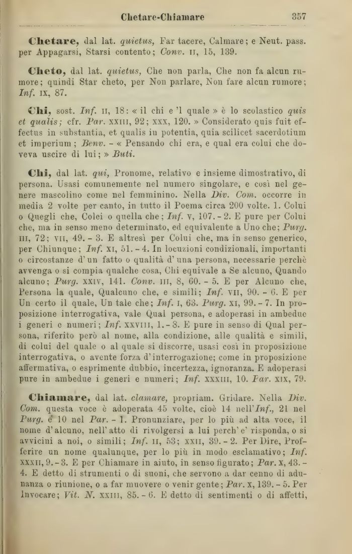 Chiamare, dal lat. clamare, propriam. Gridare. Nella Div. Com. questa voce è adoperata 45 volte, cioè 14 nell'Inf., 21 nel Purg. e* 10 nel Par. - 1. Pronunziare, per lo più ad alta voce, il nome d'alcuno, nell'atto di rivolgersi a lui perch'e' risponda, o si avvicini a noi, o simili; Inf. li, 53; xxii, 39.-2. Per Dire, Profferire un nome qualunque, per lo più in modo esclamativo; Inf. xxxii, 9.-3. E per Chiamare in aiuto, in senso figurato; Par. x, 43.-4. E detto di strumenti o di suoni, che servono a dar cenno di adunanza o riunione, o a far muovere o venir gente ; Par. x, 139. - 5. Per Invocare; Vit. N. xxm, 85.-6. E detto di sentimenti o di affetti,