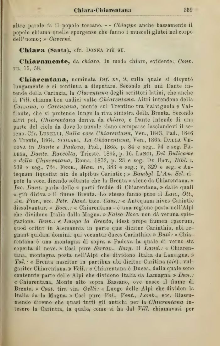 Chiarentana, nominata Inf. xv, 9, sulla quale si disputò lungamente e si continua a disputare. Secondo gli uni Dante intende della Carinzia, la Clarentana degli scrittori latini, che anche il Vill. chiama ben undici volte Chiarentana. Altri intendono della Carzana, o Carenzana, monte sul Trentino tra Vaivignola e Val-fronte, che si protende lungo la riva sinistra della Brenta. Secondo altri poi, Chiarentana deriva da chiaro, e Dante intende di una parte del cielo da dove le nuvole siano scomparse lasciandovi il sereno. Cfr. Lunelli, Sulla voce Chiarentana, Ven., 1843, Pad., 1846 e Trento, 1864. Scolari, La Chiarentana, Ven., 1865. Dalla Vedova in Dante e Padova, Pad., 1865, p. 84 e seg., 94 e seg. Palesa, Dante. Raccolta, Trieste, 1865, p. 16. Lanci, Del Bulicame e della Chiarentana, Roma, 1872, p. 23 e seg. De Bat., Bibl. i, 539 e seg., 724. Ferr., Man. iv, 383 e seg.; v, 329 e seg. « An-tequam liquefiat nix de alpibus Carintie; » Bambgl. L\An. Sei. ripete la voce, dicendo soltanto che la Brenta « viene da Chiarentana. » Iac. Dant. parla delle « parti fredde di Chiarentana, » dalle quali « giù diriva » il fiume Brenta. Lo stesso fanno pure il Lan., Ott., An. Fior., ecc. Petr. Dant. tace. Cass.: « Antequam nives Carintie dissolvantur. » Bocc.: « Chiarentana - è una regione posta nell'Alpi che dividono Italia dalla Magna. » Falso Bocc. non dà veruna spiegazione. Benv.: « Lungo la Brenta, idest prope fiumen ipsorum, quod oritur in Alemannia in parte quse dicitur Carinthia, ubi re-gnant quidam domini, qui vocantur duces Carinthise. » Buti: « Chiarentana è una montagna di sopra a Padova la quale di verno sta coperta di neve. » Così pure Serrav., Barg. Il Land.: « Chiarentana, montagna posta nell'Alpi che dividono Italia da Lamagna. » Tal.: « Brenta nascitur in partibus ubi dicitur Caritina (sic) ; vul-gariter Chiarentana.» Veli.: « Chiarentana è Ducea, dalla quale sono contenute parte delle Alpi che dividono Italia da Lamagna. » Dan.: « Chiarentana, Monte alto sopra Bassano, ove nasce il fiume di Brenta. » Cast, tira via. Gelli: « Luogo delle Alpi che dividon la Italia da la Magna. » Così pure Voi., Vent., Lomb., ecc. Riassumendo diremo che quasi tutti gli antichi per la Chiarentana intesero la Carintia, la quale!, come si ha dal Vill. chiamavasi per
