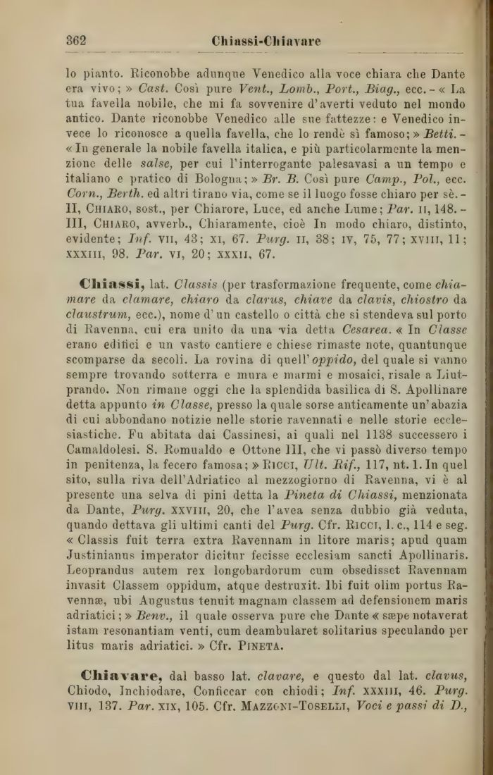 Chiassi, lat. Classis (per trasformazione frequente, come chiamare da clamare, chiaro da clarus, chiave da clavis, chiostro da claustrum, ecc.), nome d'un castello o città che si stendeva sul porto di Ravenna, cui era unito da una -via detta Cesarea. « In Classe erano editici e un vasto cantiere e chiese rimaste note, quantunque scomparse da secoli. La rovina di quell' oppido, del quale si vanno sempre trovando sotterra e mura e marmi e mosaici, risale a Liut-prando. Non rimane oggi che la splendida basilica di S. Apollinare detta appunto in Classe, presso la quale sorse anticamente un'abazia di cui abbondano notizie nelle storie ravennati e nelle storie ecclesiastiche. Fu abitata dai Cassinesi, ai quali nel 1138 successero i Camaldolesi. S. Romualdo e Ottone 111, che vi passò diverso tempo in penitenza, la fecero famosa; » Ricci, TJlt. Rif., 117, nt. 1. In quel sito, sulla riva dell'Adriatico al mezzogiorno di Ravenna, vi è al presente una selva di pini detta la Pineta di Chiassi, menzionata da Dante, Purg. xxvni, 20, che l'avea senza dubbio già veduta, quando dettava gli ultimi canti del Purg. Cfr. Ricci, 1. c., 114 e seg. « Classis fuit terra extra Ravennani in litore maris; apud quam Justinianus imperator dicitur fecisse ecclesiam sancti Apollinaris. Leoprandus autem rex longobardorum cum obsedisset Ravennam invasit Classem oppidum, atque destruxit. Ibi fuit olim portus Ravenna, ubi Augustus tenuit magnam classem ad defensionem maris adriatici ;» Benv., il quale osserva pure che Dante « ssepe notaverat istam resonantiam venti, cum deambularet solitarius speculando per litus maris adriatici. » Cfr. Pineta.