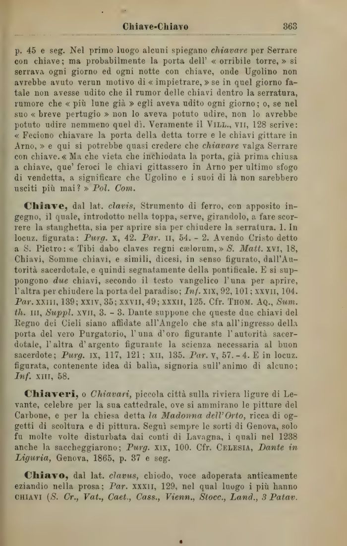 Chiave, dal lat. clavis, Strumento di ferro, con apposito ingegno, il quale, introdotto nella toppa, serve, girandolo, a fare scorrere la stanghetta, sia per aprire sia per chiudere la serratura. 1. In locuz. figurata: Purg. x, 42. Par. li, 54. - 2. Avendo Cristo detto a S. Pietro: « Tibi dabo claves regni cselorum, » S. Matt. xvi, 18, Chiavi, Somme chiavi, e simili, dicesi, in senso figurato, dall'Autorità sacerdotale, e quindi segnatamente della pontificale. E si suppongono due chiavi, secondo il testo vangelico l'una per aprire, l'altra per chiudere la porta del paradiso; Inf. xix, 92, 101; xxvii, 104. Par. xxiii, 139; xxiv, 35; xxvii, 49; xxxii, 125. Cfr. Thom. Aq., Sum. ili. in, Suppl. xvn, 3. - 3. Dante suppone che queste due chiavi del Pegno dei Cieli siano affidate all'Angelo che sta all'ingresso della porta del vero Purgatorio, l'una d'oro figurante l'autorità sacerdotale, l'altra d'argento figurante la scienza necessaria al buon sacerdote; Purg. ix, 117, 121; xn, 135. Par.Y, 57.-4. E in locuz. figurata, contenente idea di balìa, signoria sull'animo di alcuno; Inf. xiii, 58.