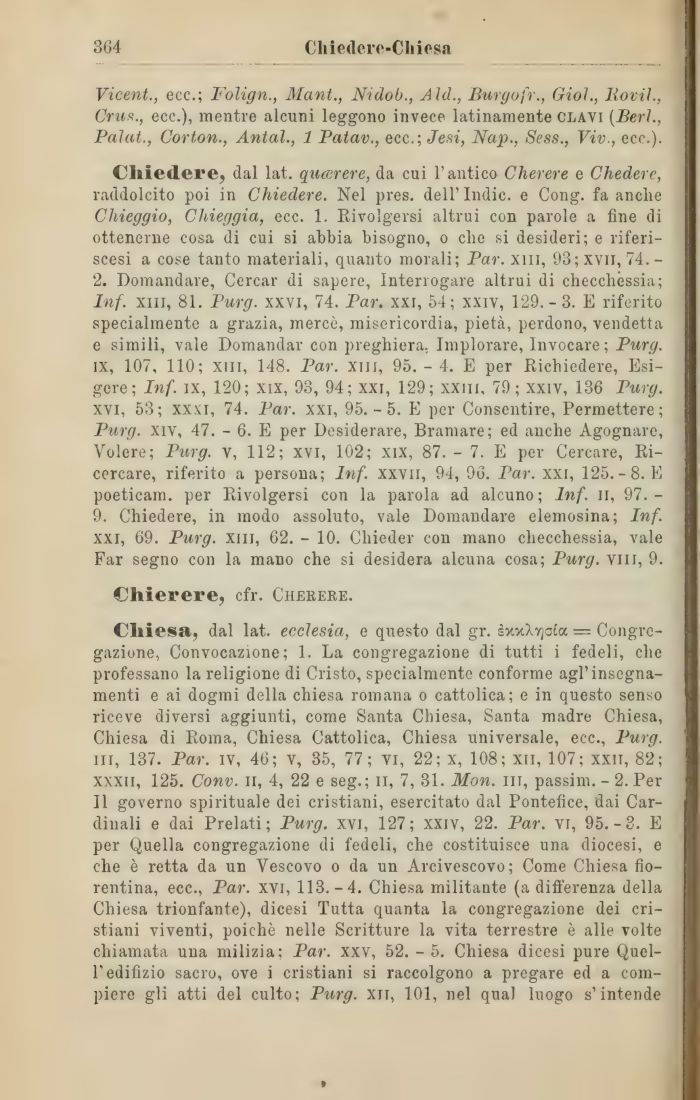 Chiesa, dal lat. ecclesia, e questo dal gr. sxxXvjaia == Congregazione, Convocazione; 1. La congregazione di tutti i fedeli, che professano la religione di Cristo, specialmente conforme agl'insegnamenti e ai dogmi della chiesa romana o cattolica; e in questo senso riceve diversi aggiunti, come Santa Chiesa, Santa madre Chiesa, Chiesa di Roma, Chiesa Cattolica, Chiesa universale, ecc., Purg. in, 137. Par. ìv, 46; v, 35, 77; vi, 22; x, 108; xii, 107; xxn, 82; xxxii, 125. Conv. n, 4, 22 e seg.; il, 7, 31. Mon. iit, passim. - 2. Per Il governo spirituale dei cristiani, esercitato dal Pontefice, dai Cardinali e dai Prelati; Purg. xvi, 127; xxiv, 22. Par. vi, 95.-3. E per Quella congregazione di fedeli, che costituisce una diocesi, e che è retta da un Vescovo o da un Arcivescovo; Come Chiesa fiorentina, ecc., Par. xvi, 113. -4. Chiesa militante (a differenza della Chiesa trionfante), dicesi Tutta quanta la congregazione dei cristiani viventi, poiché nelle Scritture la vita terrestre è alle volte chiamata una milizia; Par. xxv, 52. - 5. Chiesa dicesi pure Quell'edilizio sacro, ove i cristiani si raccolgono a pregare ed a compiere gli atti del culto; Purg. xtl, 101, nel qual luogo s'intende
