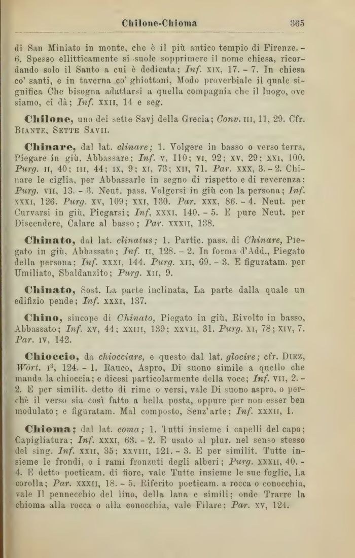 Chin are, dal lat. clinare; 1. Volgere in basso o verso terra, Piegare in giù, Abbassare; Inf. v, 110; vi, 92; xv, 29; xxi, 100. Purg. il, 40; in, 44; ix, 9; xi, 73; xn, 71. Par. xxx, 3.-2. Chinare le ciglia, per Abbassarle in segno di rispetto e di reverenza; Purg. vii, 13. - 3. Neut. pass. Volgersi in giù con la persona; Inf. xxxi, 126. Purg. xv, 109; xxi, 130. Par. xxx, 86.-4. Neut. per Curvarsi in giù, Piegarsi; Inf, xxxi, 140.-5. E pure Neut. per Discendere, Calare al basso ; Par. xxxii, 138.