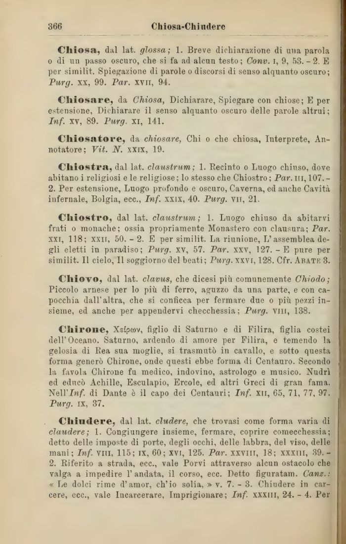 Chiostro, dal lat. claustrum; 1. Luogo chiuso da abitarvi frati o monache; ossia propriamente Monastero con clausura; Par. xxi, 118; xxir, 50. - 2. E per similit. La riunione, L'assemblea degli eletti in paradiso; Purg. xv, 57. Par. xxv, 127. - E pure per similit. Il cielo, Il soggiorno del beati; Purg. xxvi, 128. Cfr. Abate 3.