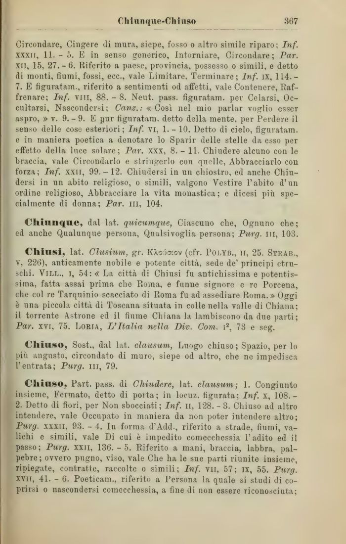 Chiusi, lat. Clusium, gr. KXojaiov (cfr. Polyb., ti, 25. Strab., v, 226), anticamente nobile e potente città, sede de' principi etruschi. vlll., i, 54: « La città di Chiusi fu antichissima e potentissima, fatta assai prima che Roma, e funne signore e re Porcena, che col re Tarquinio scacciato di Roma fu ad assediare Roma.» Oggi è una piccola città di Toscana situata in colle nella valle di Chiana; il torrente Astrone ed il fiume Chiana la lambiscono da due parti; Par. xvi, 75. Loria, L'Italia nella Div. Com. i2, 73 e seg.