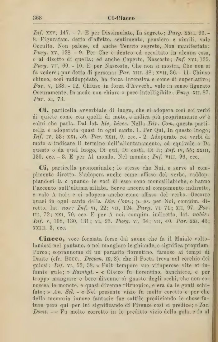 Ci, particella avverbiale di luogo, che si adopera così coi verbi di quiete come con quelli di moto, e indica più propriamente ov'è colui che parla. Dal lat. Me, hicce. Nella Div. Com. questa particella è adoperata quasi in ogni canto. 1. Per Qui, In questo luogo; Inf. iv, 53; xxi, 59. Par. xxn, 9, ecc. - 2. Adoperato coi verbi di moto a indicare il termine dell'allontanamento, ed equivale a Da questo o da quel luogo, Di qui, Di costì, Di lì; Inf. iv, 55; xxm, 130, ecc. - 3. E per Al mondo, Nel mondo; Inf. vili, 96, ecc.