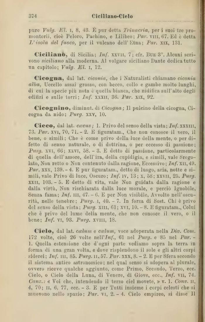 Cielo, dal lat. ccelum e coelum, voce adoperata nella Div. Coni. 172 volte, cioè 26 volte neìVInf., 61 nel Purg. e 85 nel Par. -1. Quella estensione che d'ogni parte vediamo sopra la terra in forma di una gran volta, e dove risplendono il sole e gli altri corpi siderei ; Inf. in, 85. Purg. n, 57. Par. xxx, 8. - 2. E per Sfera secondo il sistema antico astronomico ; nel qual senso si adopera al plurale, ovvero riceve qualche aggiunto, come Primo, Secondo, Terzo, ecc. Cielo, o Cielo della Luna, di Venere, di Giove, ecc., Inf. vii, 74. Canz.: « Voi che, intendendo il terzo ciel movete, » v. 1. Conv. il, 4, 70; il, 6, 77, ecc. - 3. E per Tutti insieme i corpi celesti che si muovono nello spazio; Par. vi, 2.-4. Cielo empireo, si disse II