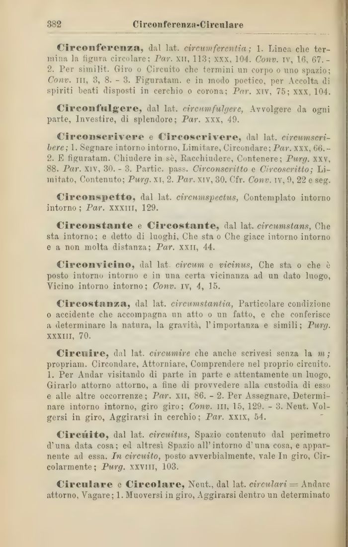 Circonferenza,, dal lat. tir cum ferenti a ; 1. Linea che termina la figura circolare; Par. xii, 113; xxx, 104. Conv. iv, 16, 67.-2. Per similit. Giro o Circuito che termini un corpo o uno spazio; Conv. in, 3, 8. - 3. Figuratam. e in modo poetico, per Accolta di spiriti beati disposti in cerchio o corona; Par. xiv, 75; xxx, 104.