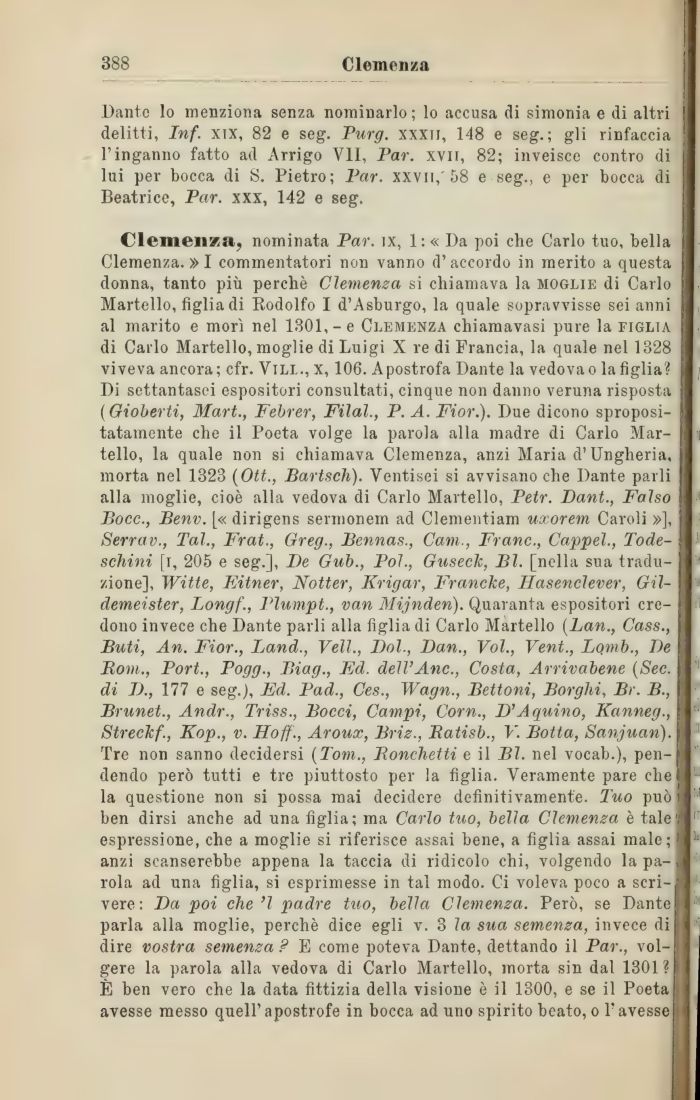 Clemenza, nominata Par. ix, 1:« Da poi che Carlo tuo, bella Clemenza. » I commentatori non vanno d'accordo in merito a questa donna, tanto più perchè Clemenza si chiamava la moglie di Carlo Martello, figlia di Rodolfo I d'Asburgo, la quale sopravvisse sei anni al marito e morì nel 1301,-e Clemenza chiamavasi pure la figlia di Carlo Martello, moglie di Luigi X re di Francia, la quale nel 1328 viveva ancora; cfr. Vili., x, 106. Apostrofa Dante la vedova o la figlia? Di settantasei espositori consultati, cinque non danno veruna risposta (Gioberti, Mart., Febrer, Filai., P. A. Fior.). Due dicono spropositatamente che il Poeta volge la parola alla madre di Carlo Martello, la quale non si chiamava Clemenza, anzi Maria d'Ungheria, morta nel 1323 (Ott., Bartsch). Ventisei si avvisano che Dante parli alla moglie, cioè alla vedova di Carlo Martello, Petr. Dant., Falso Bocc., Benv. [« dirigens sermonem ad Clementiam uxorem Caroli »], Serrav., Tal., Frat., Greg., Bennas., Cam., Frane., Cappe!., Tode-schini [i, 205 e seg.], De Gub., Poi., Guseclc, Bl. [nella sua traduzione], Witte, Eitner, Notter, Krigar, Franche, Hasenclever, Gil-demeister, Longf., Plumpt., van Mijnden). Quaranta espositori credono invece che Dante parli alla figlia di Carlo Martello (Lan., Cass., Buti, An. Fior., Land., Veli., Dol., Dan., Voi., Vent., Lqmb., De j Bom., Port., Pogg., Biag., Ed. dell'Anc., Costa, Arrivabene (Sec. di IJ., 177 e seg.), Ed. Pad., Ces., Wagn., Bettoni, Borghi, Br. B., Brunet., Andr., Triss., Bocci, Campi, Com., D'Aquino, Kanneg., Streclif., Kop., v. Hoff., Aroux, Briz., Batisb., V. Botta, Sanjuan). Tre non sanno decidersi (Tom., Ronchetti e il Bl. nel vocab.), pen-l dendo però tutti e tre piuttosto per la figlia. Veramente pare che» la questione non si possa mai decidere definitivamente. Tuo può ! ben dirsi anche ad una figlia; ma Carlo tuo, bella Clemenza è tale'; espressione, che a moglie si riferisce assai bene, a figlia assai male;1 anzi scanserebbe appena la taccia di ridicolo chi, volgendo la pa- M rola ad una figlia, si esprimesse in tal modo. Ci voleva poco a seri-,1 vere: Da poi che'l padre tuo, bella Clemenza. Però, se Dante I parla alla moglie, perchè dice egli v. 3 la sua semenza, invece di • dire vostra semenza ? E come poteva Dante, dettando il Par., voi- I gere la parola alla vedova di Carlo Martello, morta sin dal 1301? I È ben vero che la data fittizia della visione è il 1300, e se il Poeta avesse messo quell' apostrofe in bocca ad uno spirito beato, o l'avesse