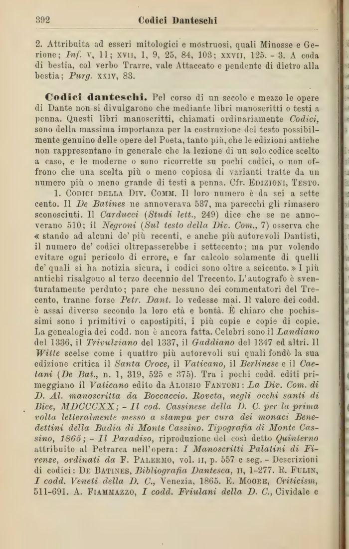 1. Codici della Div. Comm. Il loro numero è da sei a sette cento. Il De Batines ne annoverava 537, ma parecchi gli rimasero sconosciuti. Il Carducci (Studi lett., 249) dice che se ne annoverano 510; il Negroni (Sul testo della Div. Com., 7) osserva che « stando ad alcuni de' più recenti, e anche più autorevoli Dantisti, il numero de' codici oltrepasserebbe i settecento; ma pur volendo evitare ogni pericolo di errore, e far calcolo solamente di quelli de' quali si ha notizia sicura, i codici sono oltre a seicento.» I più antichi risalgouo al terzo decenuio del Trecento. L'autografo è sventuratamente perduto ; pare che nessuno dei commentatori del Trecento, tranne forse Petr. Dant. lo vedesse mai. Il valore dei codd. è assai diverso secondo la loro età e bontà. È chiaro che pochissimi sono i primitivi o capostipiti, i più copie e copie di copie. La genealogia dei codd. non è ancora fatta. Celebri sono il Landiano del 1336, il Trivulziano del 1337, il Gaddiano del 1347 ed altri. Il Witte scelse come i quattro più autorevoli sui quali fondò la sua edizione critica il Santa Croce, il Vaticano, il Berlinese e il Cae-tani (De Bat., n. 1, 319, 525 e 375). Tra i pochi codd. editi primeggiano il Vaticano edito da Aloisio FAntoni : La Div. Com. di D. Al. manoscritta da Boccaccio. Boveta, negli occhi santi di Bice, MDCCCXX; - Il cod. Cassinese della D. C. per la prima volta letteralmente messo a stampa per cura dei monaci Benedettini della Badia di Monte Cassino. Tipografia di Monte Cassino, 1865 ; - Il Paradiso, riproduzione del così detto Quinterno attribuito al Petrarca nell'opera: I Manoscritti Palatini di Firenze, ordinati da F. Palermo, voi. n, p. 557 e seg. - Descrizioni di codici : De Batines, Bibliografia Dantesca, n, 1-277. R. Fulin, I codd. Veneti della D. C., Venezia, 1865. E. Moore, Criticism, 511-691. A. Fiammazzo, I codd. Friulani della D. C., Cividale e