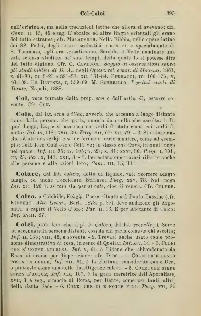 Colei, pron. fem. che al pi. fa Coloro, dal lat. ecce ille; 1. Serve ad accennare la persona distante così da chi parla come da chi ascolta; Inf. il, 133; vili, 45, e sovente. - 2. Trovasi anche usato come pronome dimostrativo di cosa, in senso di Quella; Inf. xiv, 14. - 3. Colei che s'ancise amorosa, Inf. v, 61, è Didone che, abbandonata da Enea, si uccise per disperazione; cfr. Dino. - 4. Colei CH'è tanto posta in croce, Inf. vii, 91, è la Fortuna, considerata come Dea, o piuttosto come una delle Intelligenze celesti.-5. Colei che siede sopra l'acque, Inf. xix, 107, è la gran meretrice dell'Apocalisse^ xvn, 1 e seg., simbolo di Roma, per Dante, come per tanti altri, della Santa Sede. - 6. Colei che dì e notte fila, Purg. xxi, 25