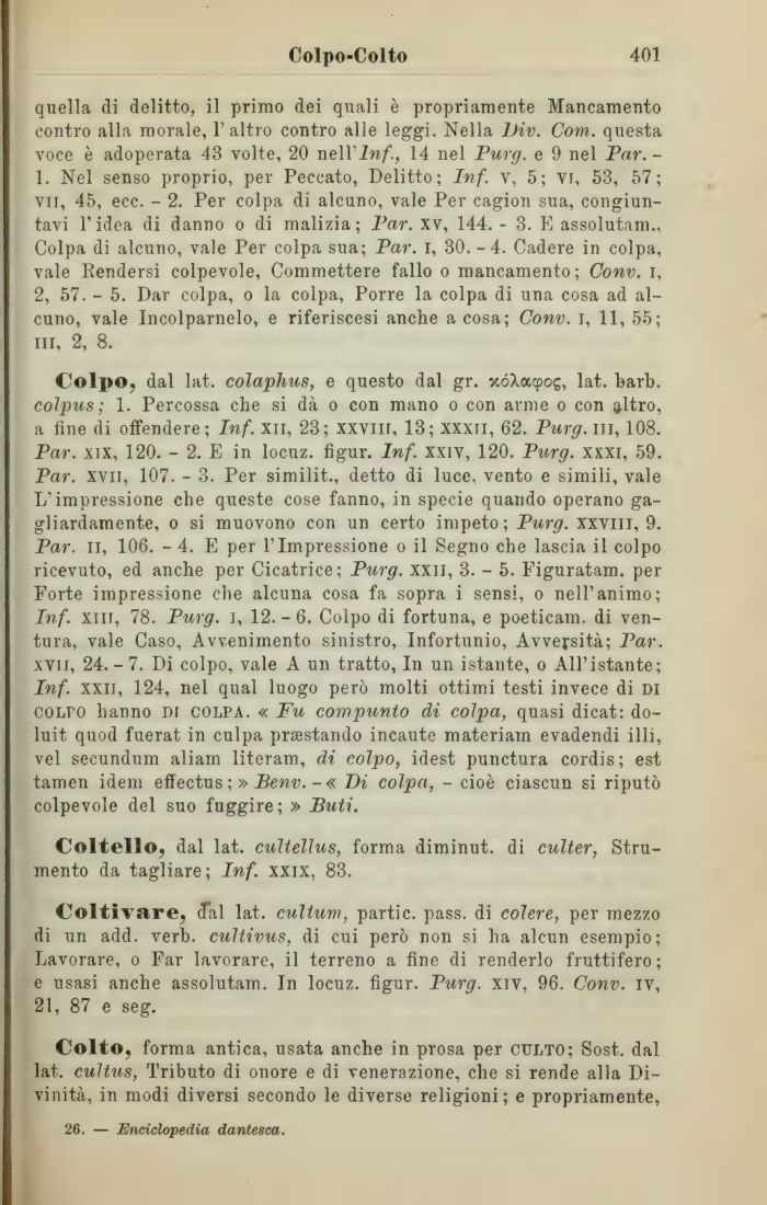 Colpo, dal lat. colaphus, e questo dal gr. xóXacpog, lat. barb. coIjjus; 1. Percossa che si dà o con mano o con arme o con altro, a fine di offendere; Inf. xn, 23; xxvill, 13; xxxii, 62. Purg. ili, 108. Par. xix, 120. - 2. E in locuz. figur. Inf. xxiv, 120. Purg. xxxi, 59. Par. xvn, 107. - 3. Per similit., detto di luce, vento e simili, vale L'impressione che queste cose fanno, in specie quando operano gagliardamente, o si muovono con un certo impeto; Purg. xxvill, 9. Par. il, 106. - 4. E per l'Impressione o il Segno che lascia il colpo ricevuto, ed anche per Cicatrice; Purg. xxii, 3. - 5. Figuratam. per Forte impressione che alcuna cosa fa sopra i sensi, o nell'animo; Inf. xiii, 78. Purg. i, 12.-6. Colpo di fortuna, e poeticam. di ventura, vale Caso, Avvenimento sinistro, Infortunio, Avversità; Par. xvif, 24. - 7. Di colpo, vale A un tratto, In un istante, o All'istante; Inf. xxii, 124, nel qual luogo però molti ottimi testi invece di di colpo hanno di colpa. « Fu compunto di colpa, quasi dicat: do-luit quod fuerat in culpa prestando incaute materiam evadendi illi, vel secundum aliam literam, di colpo, idest punctura cordis; est tamen idem effectus ;» Benv. -« Di colpa, - cioè ciascun si riputò colpevole del suo fuggire; » Buti.
