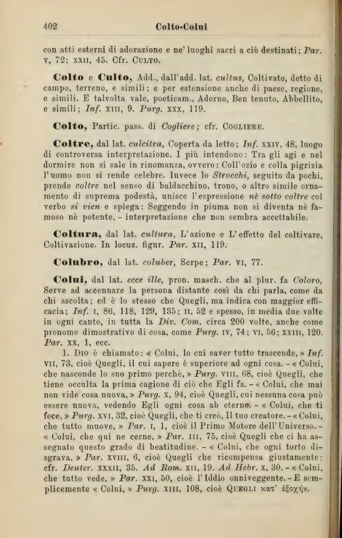 Colui, dal lat. ecce ille, pron. masch. che al plur. fa Coloro, Serve ad accennare la persona distante così da chi parla, come da chi ascolta; ed è lo stesso che Quegli, ma indica con maggior efficacia; Inf. i, 86, 118, 129, 135; il, 52 e spesso, in media due volte in ogni canto, in tutta la Div. Com. circa 200 volte, anche come pronome dimostrativo di cosa, come Purg. IV, 74; vi, 56; xxm, 120. Par. xx, 1, ecc.
