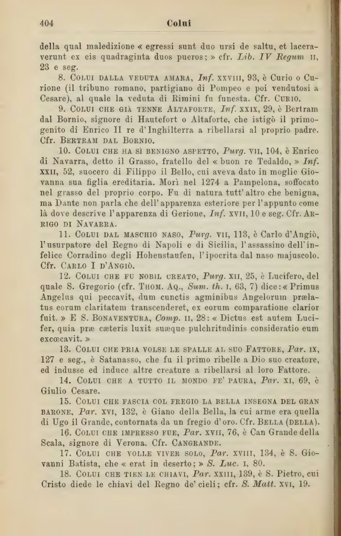 13. Colui che pria volse le spalle al suo Fattore, Par. ix, 127 e seg., è Satanasso, che fu il primo ribelle a Dio suo creatore, ed indusse ed induce altre creature a ribellarsi al loro Fattore.
