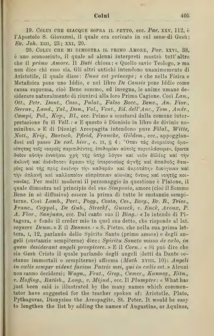 20. Colui che mi dimostra il primo Amore, Par. xxvi, 38, è uno sconosciuto, il quale ad alcuni interpreti mostrò tutt' altro che il primo Amore. 11 Buti chiosa: « Quello savio Teologo, » ma non dice chi esso sia. Gli altri antichi intendono unanimemente di Aristotile, il quale disse: Unus est princeps; e che nella Fisica e Metafisica pone uno Iddio, e nel libro De Causis pone Iddio come causa suprema, cioè Bene sommo, ed insegna, le anime umane desiderare naturalmente di riunirsi alla loro Prima Cagione. Così Lan., Ott., Petr. Dant., Cass., Paìat., Falso Bocc., Benv., An. Fior., Serrav., Land., Tal., Dan., Voi., Vent., Ed. dell'Anc., Tom., Andr., Campi, Poi., Kop., Bl., ecc. Primo a scostarsi dalla comune interpretazione fu il Veli.: « E questo è Dionisio in libro de divinis no-minibus. » E di Dionigi Areopagita intendono pure Filai., Witte, Nott., Krig., Bartsch, Pfleid, Franche, Gildem., ecc., appoggiandosi sul passo De cosi, liier., c. il, § 4 : Oiav xàc; àvofioioog ópio-lÓTYjxa£ xolg vospoìg jtepiTi&ivusc;, èra&oiitav aùtotg Tcsp»t/l(&a(i>[isv, epttìxa ¦9-sìov aÒTTjv svvofjoac )(pY] xvjg ónrjp Xóyov otal vo9v àuXC'xg noci tyjv ay.Xivvj xaì àvévSotov scpeatv ùuspouaicog àyvvjs %aì àftaS-oòs O-ew-pCocg %at xTjg rtpcg sxsivyjv tyjv xa{)-apàv %ai àxpoxdxr,(v Sta^ystav v.cti tyjv àrcXavYj xaì xaXXojioiov sÒTtpsrcstav aìamac; òvxwc, xai xoi-vcovtac;. Per molti moderni il personaggio in questione è Platone, il quale dimostra nel principio del suo Simposio, amore (cioè il Sommo Bene in sè diffusivo) essere la prima di tutte le sustanzie sempiterne. Così Lomb., Port., Pogg., Costa, Ces., Borg., Br. B., Triss., Frane., Cappel., De Gub., Streckf., Guseck, v. Enc~k, Aroux, P. A. Fior., Sanjuan, ecc. Dal canto suo il Biag.: «Io intendo di Pitagora, e fondo il creder mio in quel suo detto, che risponde al lat. sequere Deum. » E il Bennas.: « S. Pietro, che nella sua prima lettera, i, 12, parlando dello Spirito Santo (primo amore) e degli angeli (sustanzie sempiterne) dice: Spiritu Sancto misso de calo, in quem desiderant angeli prospicere. » E il Com.: « Si può dire che sia Gesù Cristo il quale parlando degli angeli (detti da Dante sostanze immortali o sempiterne) afferma (Math. xviii, 10): Angeli in ccelis semper vident faciem Patris mei, qui in ccelis est.» Alcuni non sanno decidersi; Wagn., Frat., Greg., Camer., Kanneg., Eitn., v. Hoffing., Batisb., Long., v. Mijud., ecc. Il Plumptre: « Wliat has just been said is illustrated by the many names wliicli commen-tator have suggested for the teacher spoken of': Aristotle, Plato, Pythagoras, Dionysius the Areopagite, St. Peter. It would be easy to lengthen the list by adding the names of Augustine, or Aquinas,