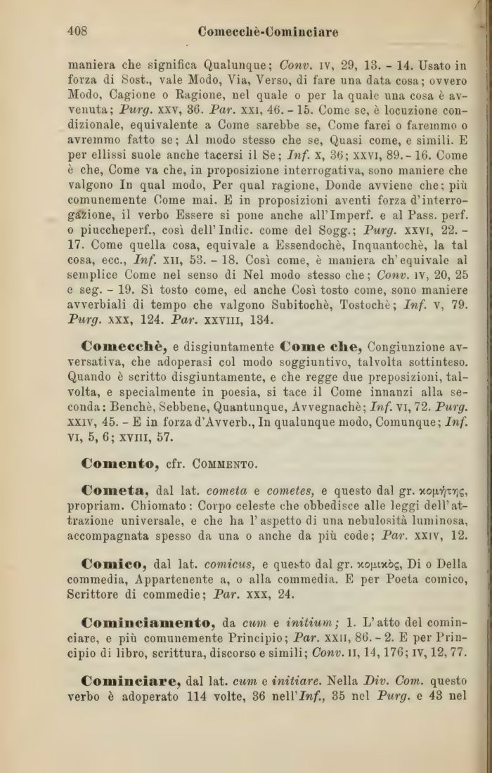 Cometa, dal lat. cometa e cometes, e questo dal gr. xofx-^-crjig, propriam. Chiomato: Corpo celeste che obbedisce alle leggi dell'attrazione universale, e che ha 1' aspetto di una nebulosità luminosa, accompagnata spesso da una o anche da più code; Par. xxiv, 12.