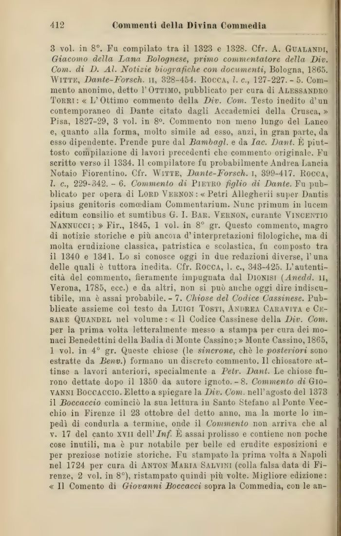 3 voi. in 8°. Fu compilato tra il 1323 e 1328. Cfr. A. Gualandi, Giacomo della Lana Bolognese, primo commentatore della Div. Com. di D. Al. Notizie biografiche con documenti, Bologna, 1865. Witti?, Dante-Forsch. n, 328-454. Rocca, l. c., 127-227.- 5. Commento anonimo, detto 1'Ottimo, pubblicato per cura di Alessandro Torri: « L'Ottimo commento della Div. Com. Testo inedito d'un contemporaneo di Dante citato dagli Accademici della Crusca, » Pisa, 1827-29, 3 voi. in 8°. Commento non meno lungo del Laneo e, quanto alla forma, molto simile ad esso, anzi, in gran parte, da esso dipendente. Prende pure dal Bambagl. e da Iac. Dant. È piuttosto compilazione di lavori precedenti che commento originale. Fu scritto verso il 1334. 11 compilatore fu probabilmente Andrea Lancia Notaio Fiorentino. Cfr. Witte, Dante-Forsch. i, 399-417. rocca, l. c., 229-342. - 6. Commento di Pietro figlio di Dante. Fu pubblicato per opera di Lord Vernon : « Petri Allegherii super Dautis ipsius genitoris comoediam Commentarium. Nunc primum in lucem editum Consilio et sumtibus G. I. Bar. Vernon, curante Vincentio Nannucci; » Fir., 1845, 1 voi. in 8° gr. Questo commento, magro di notizie storiche e più ancora d'interpretazioni filologiche, ma di molta erudizione classica, patristica e scolastica, fu composto tra il 1340 e 1341. Lo si conosce oggi in due redazioni diverse, l'una delle quali è tuttora inedita. Cfr. Rocca, 1. c., 343-425. L'autenticità del commento, fieramente impugnata dal Dionisi (Anedd. n, Verona, 1785, ecc.) e da altri, non si può anche oggi dire indiscutibile, ma è assai probabile. - 7. Chiose del Codice Cassinese. Pubblicate assieme col testo da Luigi Tosti, Andrea Caravita e Cesare Quandel nel volume : « Il Codice Cassinese della Div. Com. per la prima volta letteralmente messo a stampa per cura dei monaci Benedettini della Badia di Monte Cassino;» Monte Cassino, 1865, 1 voi. in 4° gr. Queste chiose (le sincrone, che le posteriori sono estratte da Benv.) formano un discreto commento. 11 chiosatore attinse a lavori anteriori, specialmente a Petr. Dant. Le chiose furono dettate dopo il 1350 da autore ignoto.-8. Commento di'Giovanni Boccaccio. Eletto a spiegare la Div. Com. nell'agosto del 1373 il Boccaccio cominciò la sua lettura in Santo Stefano al Ponte Vecchio in Firenze il 23 ottobre del detto anno, ma la morte lo impedì di condurla a termine, onde il Commento non arriva che al v. 17 del canto xvn dell' Inf. E assai prolisso e contiene non poche cose inutili, ma è pur notabile per belle ed erudite esposizioni e per preziose notizie storiche. Fu stampato la prima volta a Napoli nel 1724 per cura di Anton Maria Salvjni (colla falsa data di Firenze, 2 voi. in 8°), ristampato quindi più volte. Migliore edizione: « Il Comento di Giovanni Boccacci sopra la Commedia, con le an-