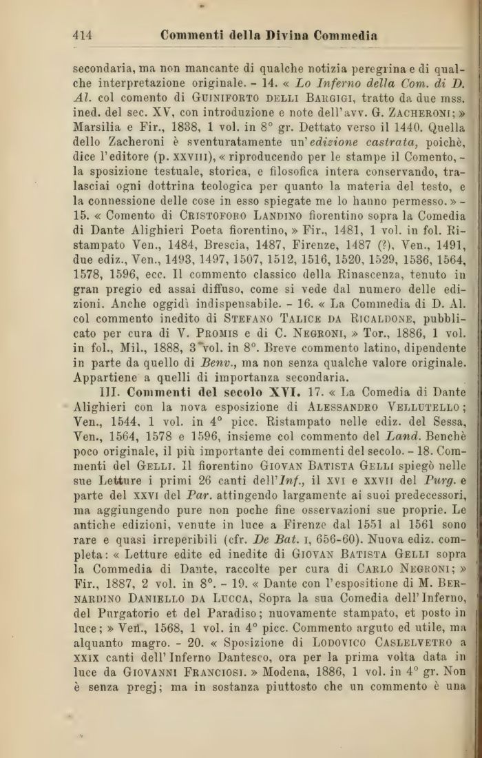 III. Commenti del secolo XVI. 17. « La Comedia di Dante Alighieri con la nova esposizione di Alessandro Vellutello ; Ven., 1544, 1 voi. in 4° picc. Ristampato nelle ediz. del Sessa, Ven., 1564, 1578 e 1596, insieme col commento del Land. Benché poco originale, il più importante dei commenti del secolo. - 18. Commenti del Gelli. Il fiorentino Giovan Batista Gelli spiegò nelle sue Letture i primi 26 canti dell'Jw/., il xvi e xxvii del Purg. e parte del xxvi del Par. attingendo largamente ai suoi predecessori, ma aggiungendo pure non poche fine osservazioni sue proprie. Le antiche edizioni, venute in luce a Firenze dal 1551 al 1561 sono rare e quasi irreperibili (cfr. De Bat. i, 656-60). Nuova ediz. completa: « Letture edite ed inedite di Giovan Batista Gelli sopra la Commedia di Dante, raccolte per cura di Carlo Negroni; » Fir., 1887, 2 voi. in 8°. - 19. « Dante con l'espositione di M. Bernardino Daniello da Lucca, Sopra la sua Comedia dell'Inferno, del Purgatorio et del Paradiso; nuovamente stampato, et posto in luce; » Veri., 1568, 1 voi. in 4° picc. Commento arguto ed utile, ma alquanto magro. - 20. « Sposizione di Lodovico Caslelvetro a xxix canti dell' Inferno Dantesco, ora per la prima volta data in luce da Giovanni Franciosi. » Modena, 1886, 1 voi. in 4° gr. Non è senza pregj; ma in sostanza piuttosto che un commento è una