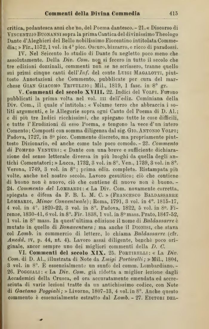 V. Commenti del secolo XVIII. 22. Indici del Volpi. Furono pubblicati la prima volta nel voi. ìli dell'ediz. Cominiana della Div. Com., il quale s'intitola: « Volume terzo che abbraccia i soliti argomenti, e le Allegorie sopra ogni Canto del Poema di D. Al.; e di più tre Indici ricchissimi, che spiegano tutte le cose difficili, e tutte l'Erudizioni di esso Poema, e tengono la vece d'un intero Comento ; Composti con somma diligenza dal sig. Gio. Antonio Volpi ; Padova, 1727, in 8° picc. Commento discreto, ma propriamente piuttosto Dizionario, ed anche come tale poco comodo. - 28. Commento di Pompeo Venturi: « Dante con una breve e sufficiente dichiarazione del senso letterale diversa in più luoghi da quella degli antichi Comentatori; » Lucca, 1732, 3 voi. in 8°. Ven., 1739, 3 voi. in 8°. Verona, 1749, 3 voi. in 8°; prima ediz. completa. Ristampata più volte, anche nel nostro secolo. Lavoro gesuitico; ciò che contiene di buono non è nuovo, ciò che contiene di nuovo non è buono. -24. Commento del Lombardi: « La Div. Com. novamente corretta, spiegata e difesa da F. B. L. M. C. » (Francesco Baldassarre Lombardi, Minor Conventuale)-, Roma, 1791, 3 voi. in 4°. 1815-17, 4 voi. in 4°. 1820-22, 3 voi. in 8°. Padova, 1822, 5 voi. in 8°. Firenze, 1830-41, 6 voi. in 8°. Fir. 1838, 1 voi. in 8° mass. Prato, 1847-52, 1 voi. in 8° mass. In quest'ultima edizione il nome di Baldassarre è mutato in quello di Bonaventura ; ma anche il Dionisi, che stava col homi), in commercio di lettere, lo chiama Baldassarre (cfr. Anedd. iv, p. 44, nt. 4). Lavoro assai diligente, benché poco originale, ancor sempre uno dei migliori commenti della D. C.