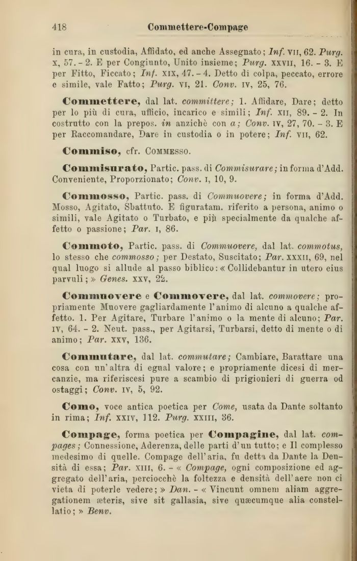 Commettere, dal lat. committere; 1. Affidare, Dare; detto per lo più di cura, ufficio, incarico e simili; Inf. xn, 89.-2. In costrutto con la prepos. in anziché con a; Conv. iv, 27, 70. - 3. E per Raccomandare, Dare in custodia o in potere; Inf. vii, 62.