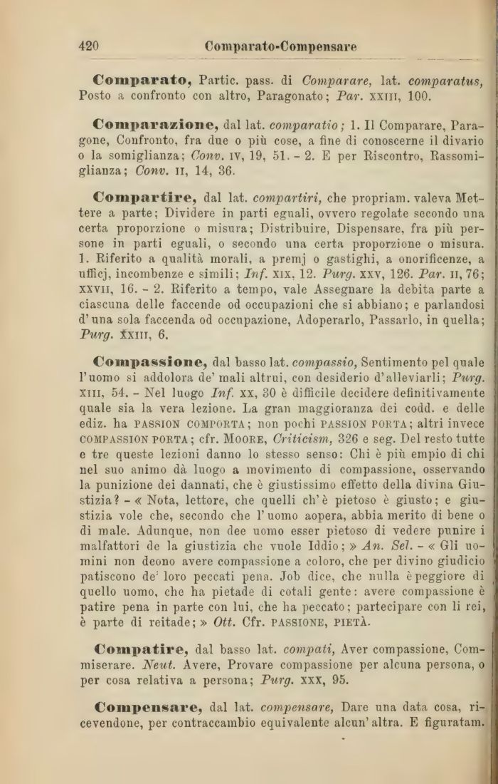 Compassione, dal basso lat. compassio, Sentimento pel quale l'uomo si addolora de' mali altrui, con desiderio d'alleviarli; Purg. xiii, 54. - Nel luogo Inf. xx, 30 è difficile decidere definitivamente quale sia la vera lezione. La gran maggioranza dei codd. e delle ediz. ha pasrion comporta; non pochi passion porta; altri invece compassion porta ; cfr. Moore, Criticism, 326 e seg. Del resto tutte e tre queste lezioni danno lo stesso senso: Chi è più empio di chi nel suo animo dà luogo a movimento di compassione, osservando la punizione dei dannati, che è giustissimo effetto della divina Giustizia? - « Nota, lettore, che quelli eh'è pietoso è giusto; e giustizia vole che, secondo che 1' uomo aopera, abbia merito di bene o di male. Adunque, non dee uomo esser pietoso di vedere punire i malfattori de la giustizia che vuole Iddio; » An. Sei. - « Gli uomini non deono avere compassione a coloro, che per divino giudicio j patiscono de: loro peccati pena. Job dice, che nulla è peggiore di quello uomo, che ha pietade di cotali gente : avere compassione è patire pena in parte con lui, che ha peccato; partecipare con li rei, è parte di reitade;» Ott. Cfr. passione, pietà.