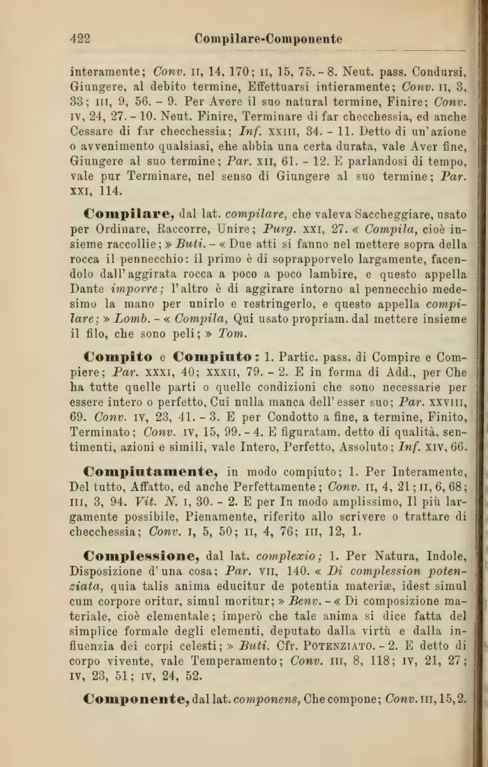 Compito e Compiuto ; 1. Partic. pass, di Compire e Compiere; Par. xxxi, 40; xxxii, 79. - 2. E in forma di Add., per Che ha tutte quelle parti o quelle condizioni che sono necessarie per essere intero o perfetto, Cui nulla manca dell'esser suo; Par. xxviii, 69. Conv. iv, 23, 41. - 3. E per Condotto a fine, a termine, Finito, Terminato; Conv. iv, 15, 99.-4. E figuratam. detto di qualità, sentimenti, azioni e simili, vale Intero, Perfetto, Assoluto; Inf. xiv, 66.